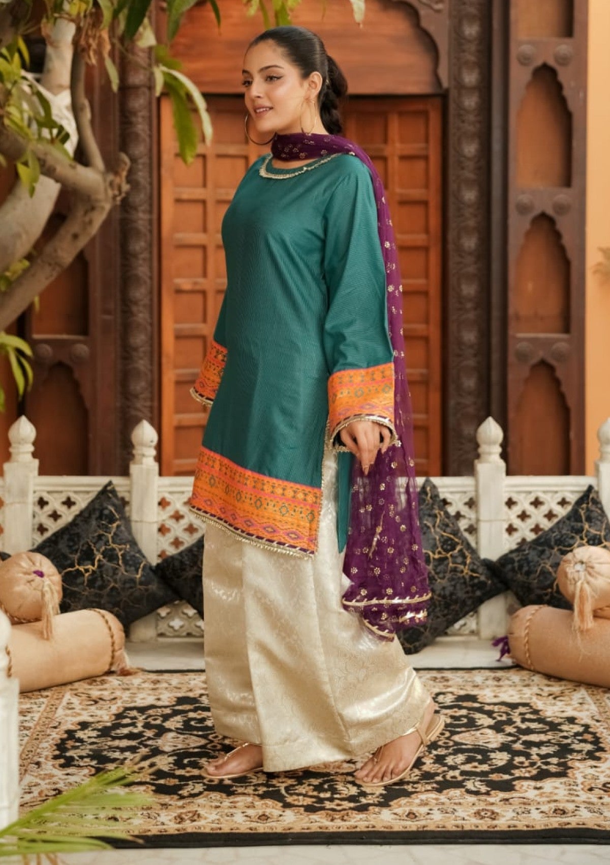 Shirt crafted in masoori lawn with contrast golden and orange thappa detailing, paired with a golder off-white jacquard Clapper, and finished with a contrast purple net dupatta adorned with golden thappa boti and delicate kiran edging.