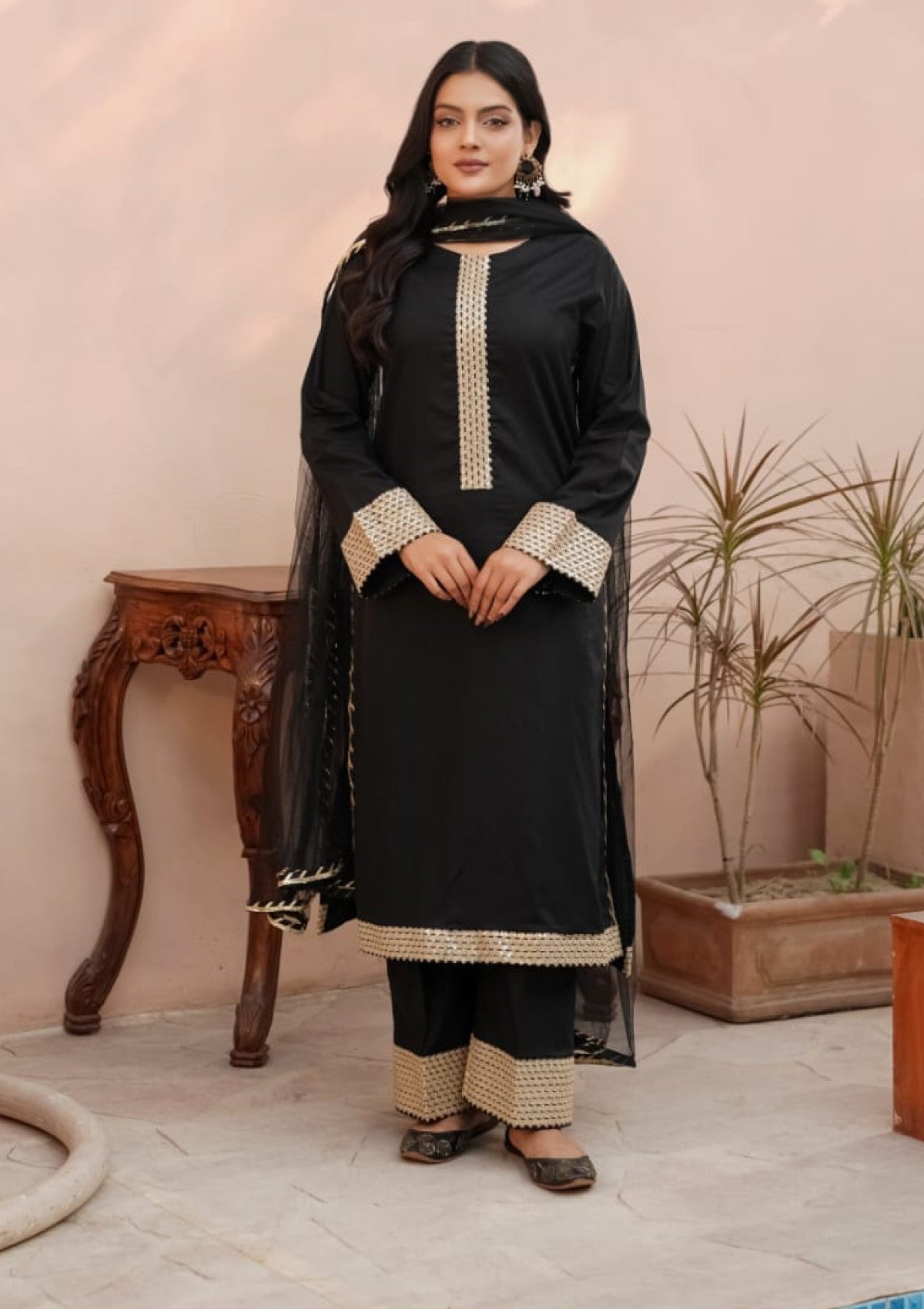 Cambric cotton shirt embroidered with golden tila and sitara work, paired with a black flapper featuring tila detailing on the paincha, and completed with a net dupatta embellished with golden gota and chata patti.