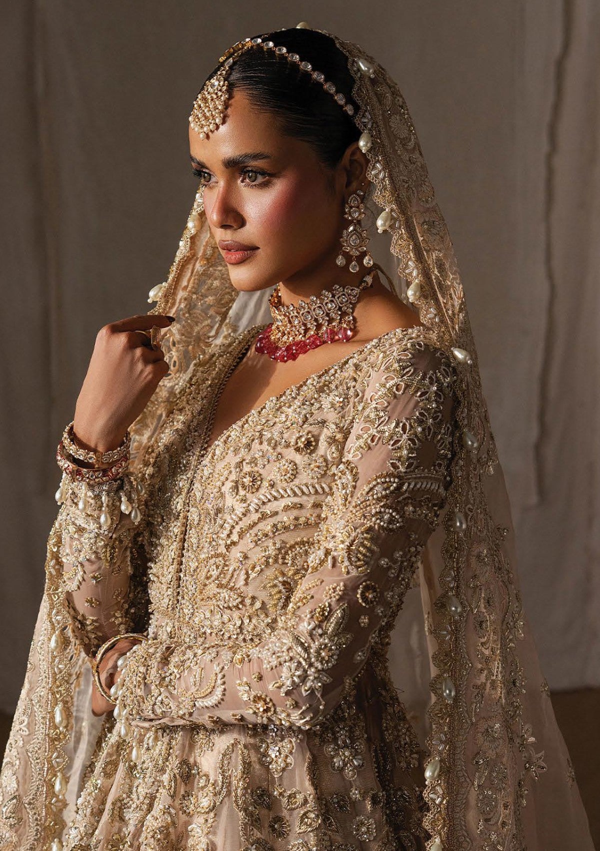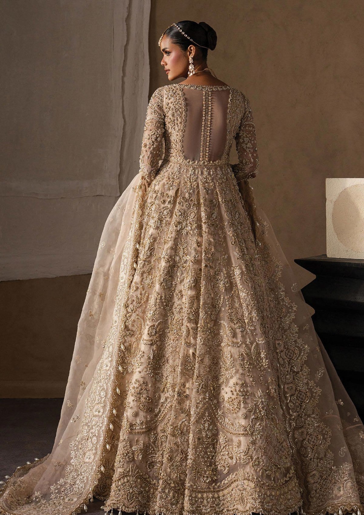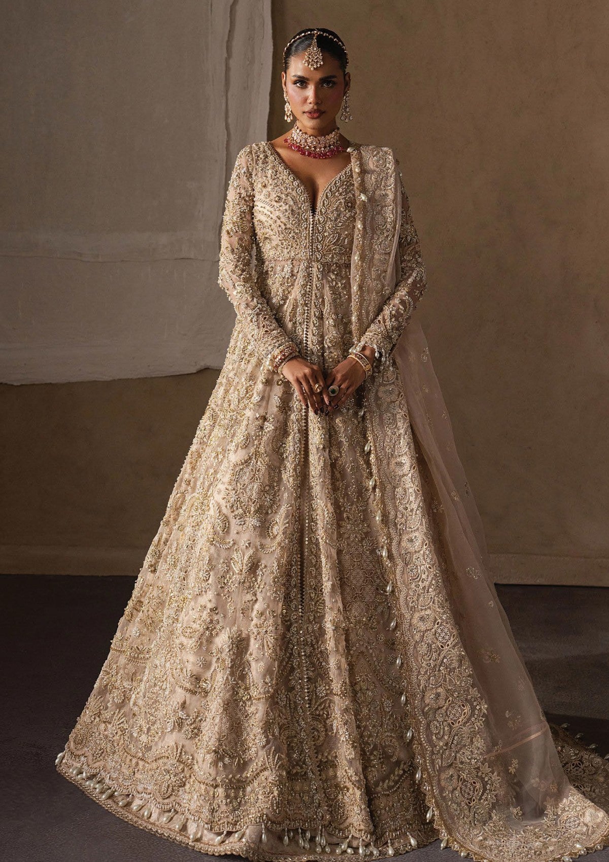 A resplendent ensemble unfolds in a luminous champagne hue, adorned with meticulous hand-embellishment that traces the silhouette in regal harmony. Intricate embroidery in antique gold threads carves ornate borders, blooming florals, and heirloom motifs that descend from the sculpted bodice into the sweeping grandeur of the skirt. The lehenga reveals layers of artistry, creating depth, fluid movement, and an undeniable aura of royalty. A diaphanous dupatta, richly adorned yet ethereal in finish, is framed with elaborate edging and delicate accents, softening the architectural richness of the attire. The look is unapologetically majestic — a celebration of bridal splendor, masterful craftsmanship, and timeless elegance brought to life through light, texture, and shimmer.