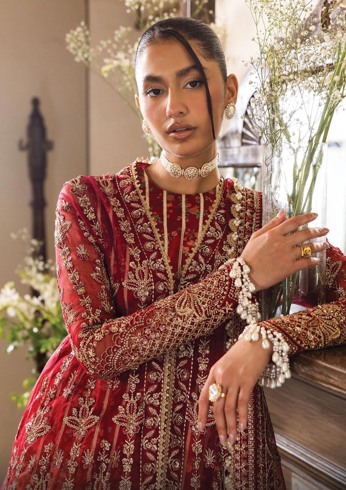 RED ORGANZA EMBROIDERED SLEEVES 2 PCS