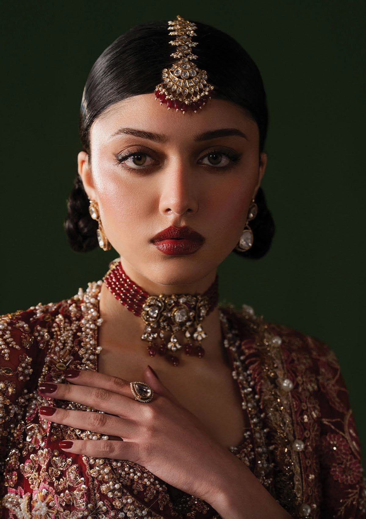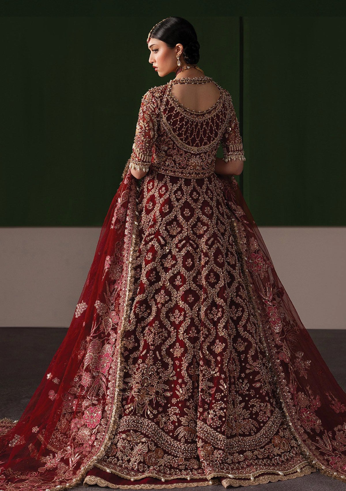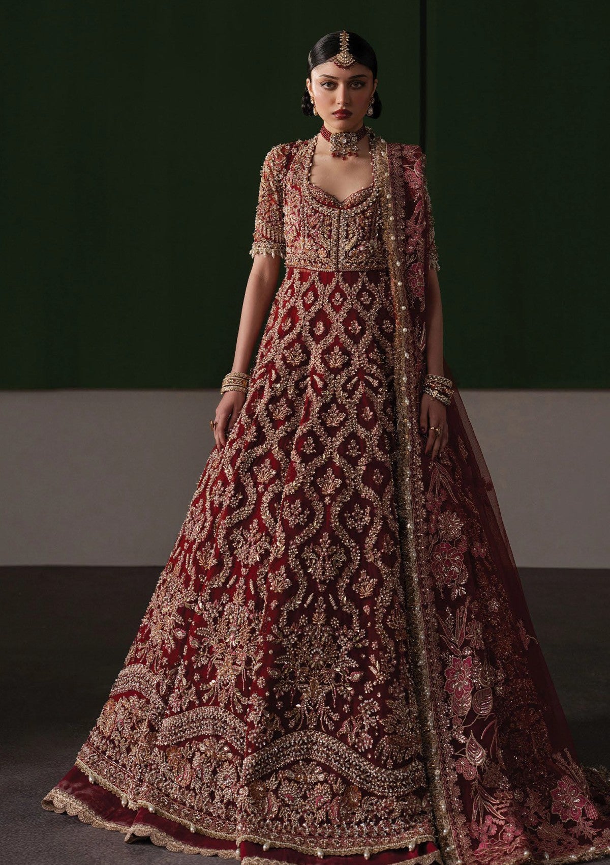 A long bridal ensemble crafted in a deep wine-red hue, enveloped in dense hand-embellishment that spans the silhouette with opulent precision. Intricate antique gold embroidery forms flowing floral and lattice motifs across the elongated top and continues seamlessly into the voluminous lehgna beneath, creating a rich, continuous narrative of craftsmanship. The lehgna is framed with ornate borders and layered detailing, adding depth and ceremonial weight with every fold. A matching sheer dupatta, lavishly embroidered and edged with heavy handwork, drapes gracefully to soften the intensity of the embellishment. The ensemble embodies timeless bridal grandeur — bold in colour, rich in heritage, and defined by meticulous artistry.