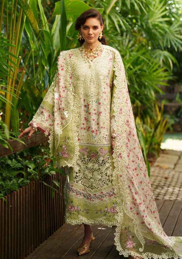 A beautifully composed chikankari lawn ensemble adorned with intricately embroidered panels, complemented by delicate organza detailing along the neckline, scattered motifs, and refined borders. Paired with a printed monark dupatta and cambric trousers finished with elegant organza accents, this look radiates timeless sophistication and graceful charm.