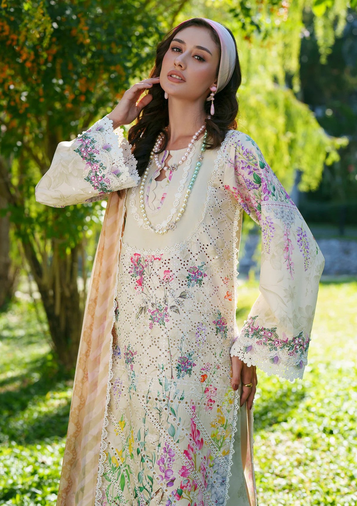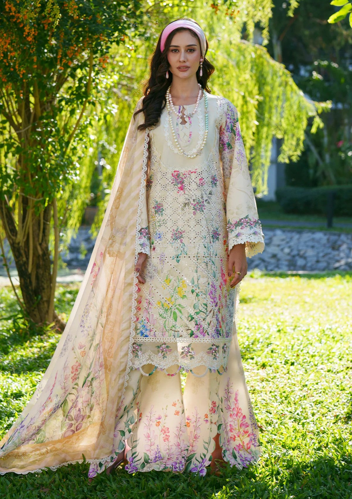 LILA is a charming ensemble featuring a printed lawn shirt enhanced with intricate Chikankari embroidery on the front and delicate sleeve borders. The printed sleeves and back bring subtle sophistication, paired with printed cotton trousers. A flowing chiffon printed dupatta completes the look, exuding effortless elegance.