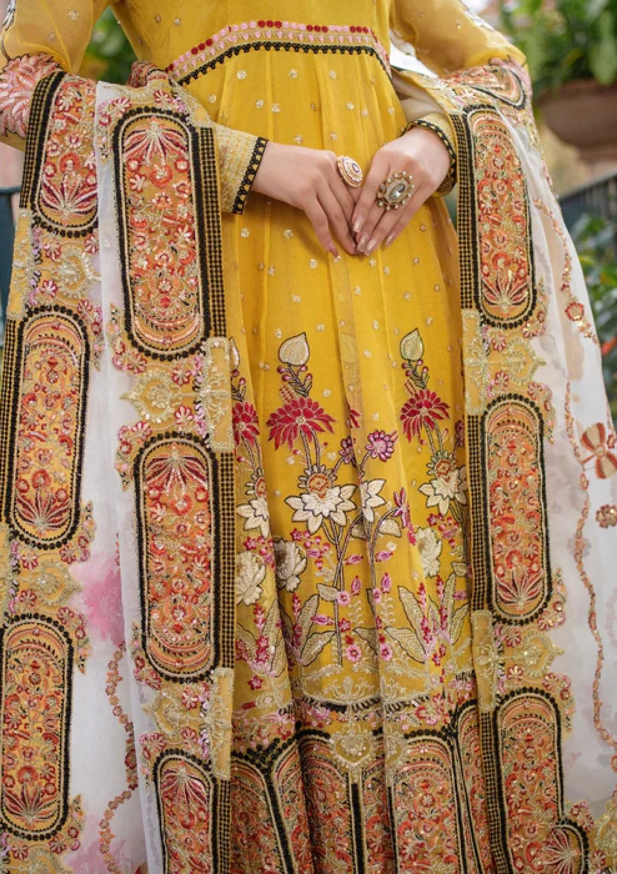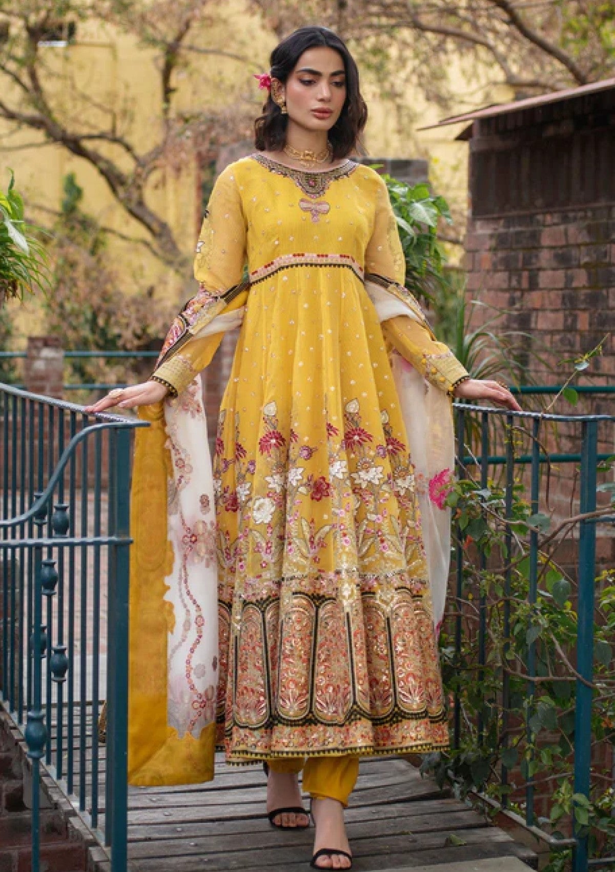 Saffron yellow pishwas set intricately embroidered in black and white thread work, featuring delicate motifs that adorn the fabric, creating an elegant silhouette.. Paired with an embroidered white organza dupatta, showcasing geometric borders with intricate embroidery, crafted from lightweight organza fabric with a soft, flowing texture.