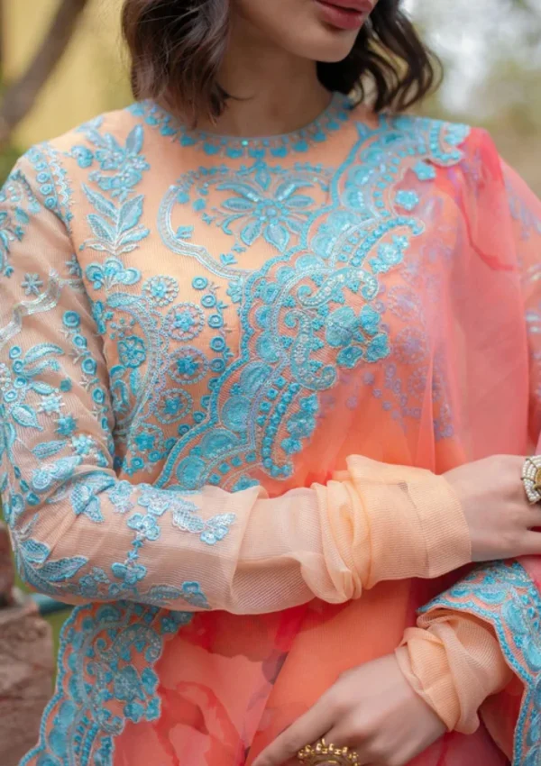 Coral sharara set with maya blue floral embroidery, paired with an embroidered organza dupatta featuring a hand-rendered base and delicate border motifs.