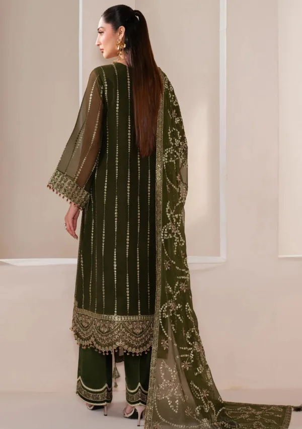 The “Olivia” ensemble is a striking piece, showcasing an olive green chiffon shirt with a meticulously hand-embellished neckline, adorned with a stunning array of intricate pearl details for a luxurious touch. It is paired with an embroidered chiffon dupatta and Russian grip trousers, making it the perfect choice for an unforgettable festive season.
