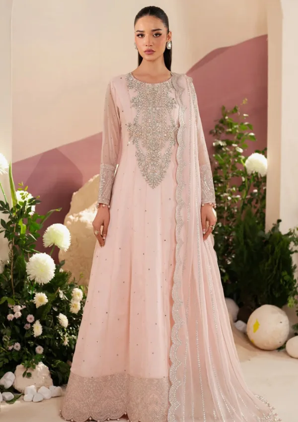 “Dazzle” is a captivating powder pink muskaish chiffon ensemble, featuring an intricately embroidered neckline with contrasting threads, beautifully enhanced by delicate hand embellishments. The outfit is completed with a graceful chiffon dupatta, showcasing a detailed four-sided embroidered border, and paired with raw silk trousers for a refined finish.