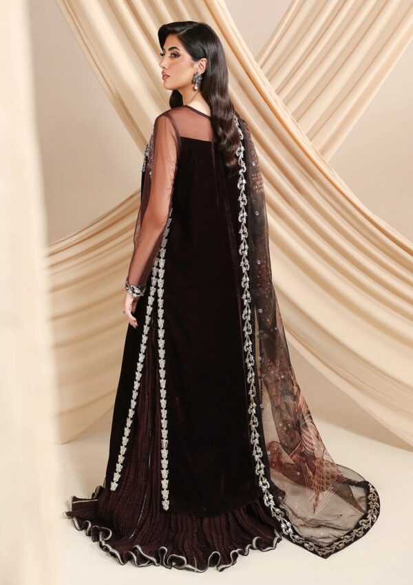 The luxurious formal ensemble showcases a deep brown velvet A-line shirt, accentuated by a handcrafted, embroidered front neck in silver and gold metallic. The piece features dyed net sleeves and is paired with a sophisticated printed net dupatta with an ornate border. Coordinating dark trousers, are finished with an organza patch accent, creating a refined look perfect for an evening occasion.