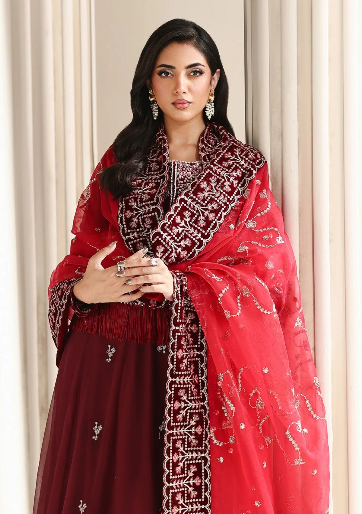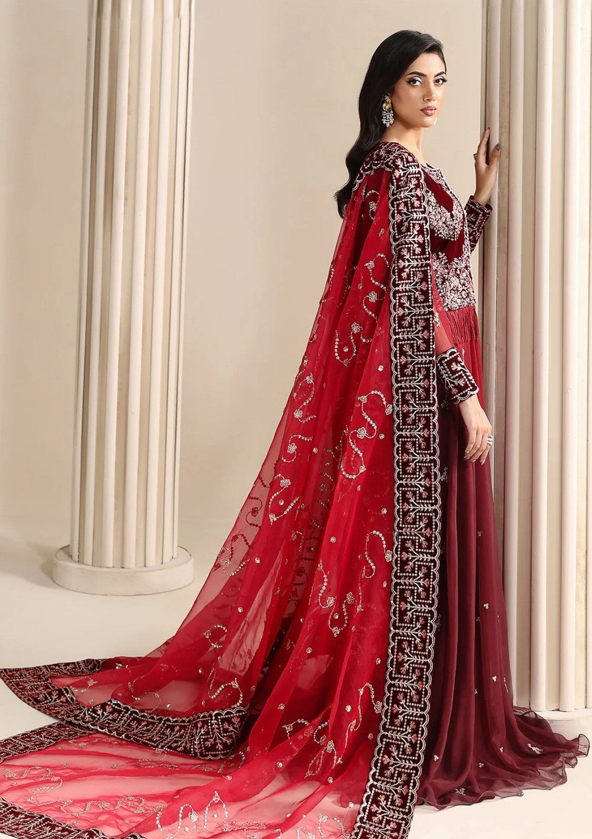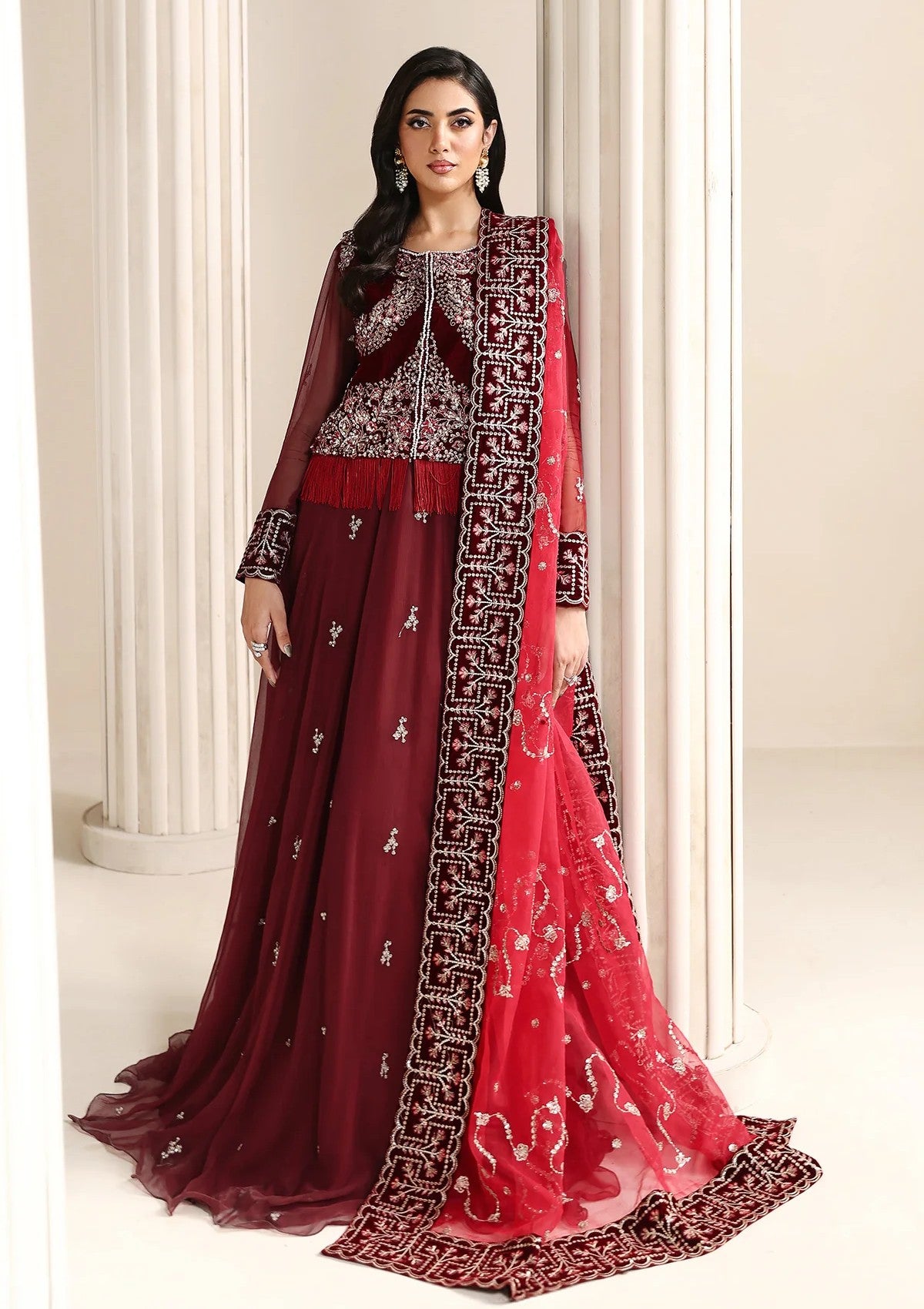 A deep crimson red ensemble featuring a hand-embellished velvet front left yoke with detailed embroidery and handmade work. The embroidered chiffon front, back, and sleeves pair elegantly with a dyed Russian silk trouser, while the flared long silhouette is completed with an embroidered chiffon dupatta finished with a velvet border.