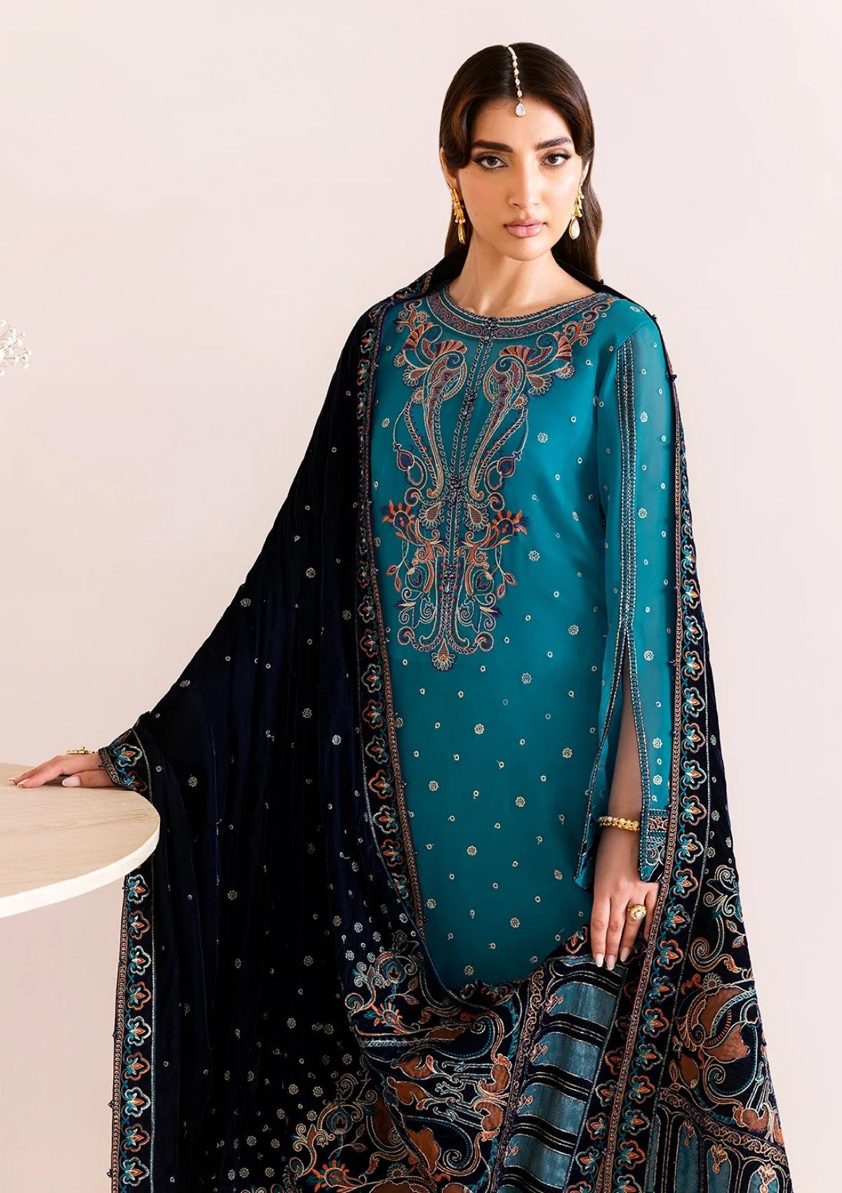 Rendered in a captivating cerulean teal hue, the design features a straight long silhouette crafted from bamber chiffon. The front is intricately embroidered with delicate threadwork and motifs, while the velvet sleeves border adds a touch of regal charm. Paired with a dyed Russian grip trouser featuring an embroidered patch on the hem, the look is completed with a contrasting navy velvet dupatta enriched with intricate borders and patterns