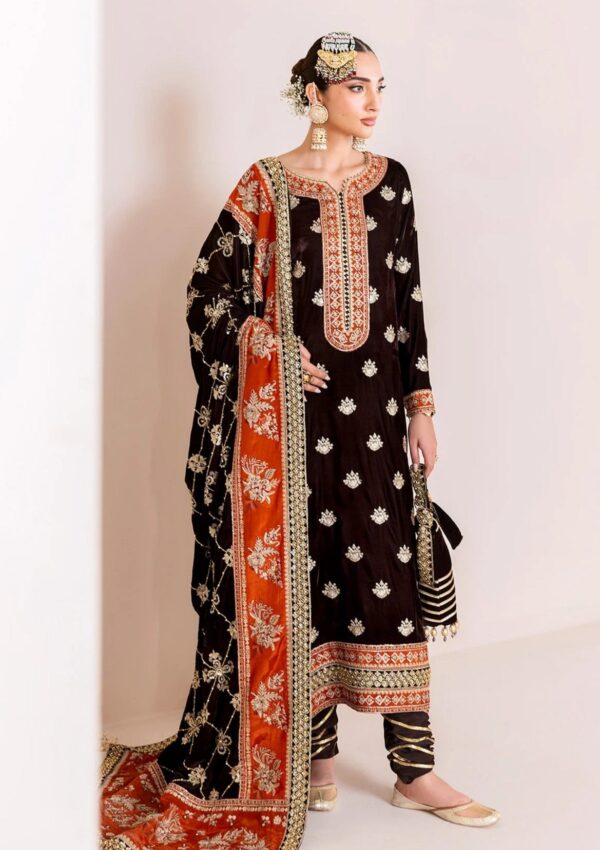 An opulent black kameez crafted with an intricately embroidered grip front neckline, adorned with delicate motifs and an exquisitely detailed border. Paired with a dyed Russian grip trouser featuring an embroidered hem for a touch of sophistication. The look is completed with a handcrafted velvet shawl in rich rust and black hues, meticulously embellished with elaborate embroidery and a luxurious border