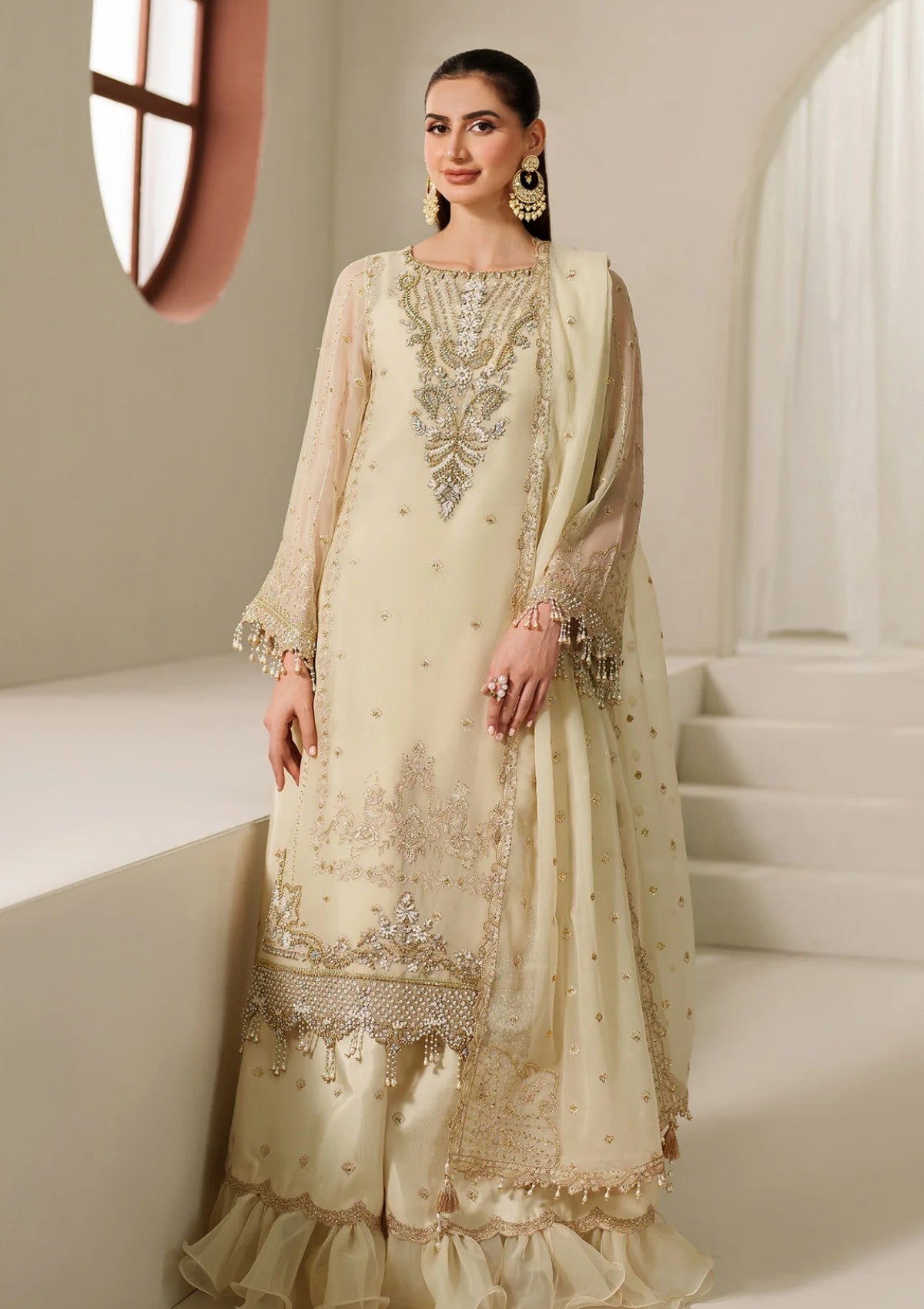 A soft beige ensemble crafted with embroidered chiffon panels, enhanced by a front kali and intricate organza neckline patch. The raw silk trousers and embroidered organza chiffon dupatta complete the look with a touch of tradition and style