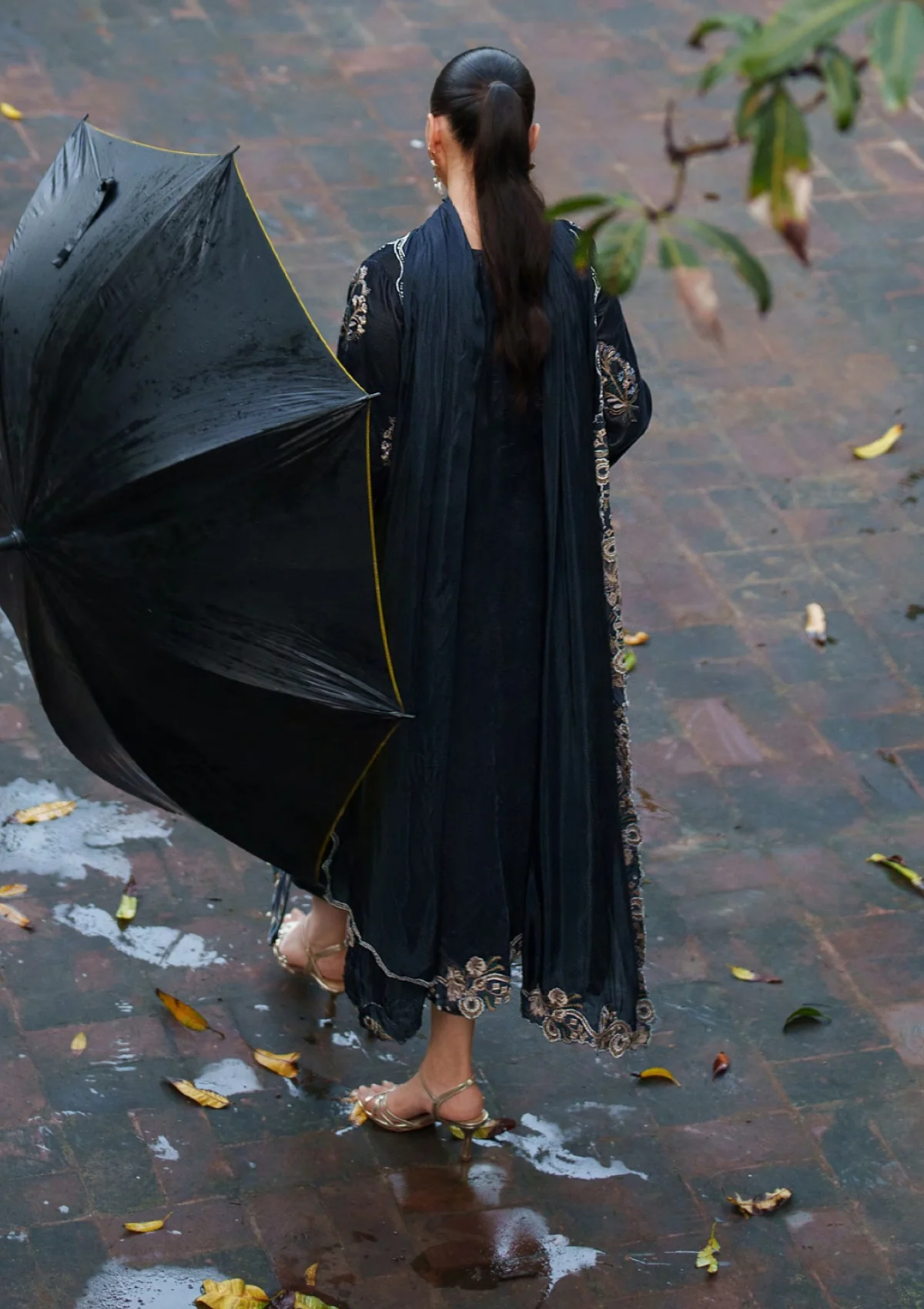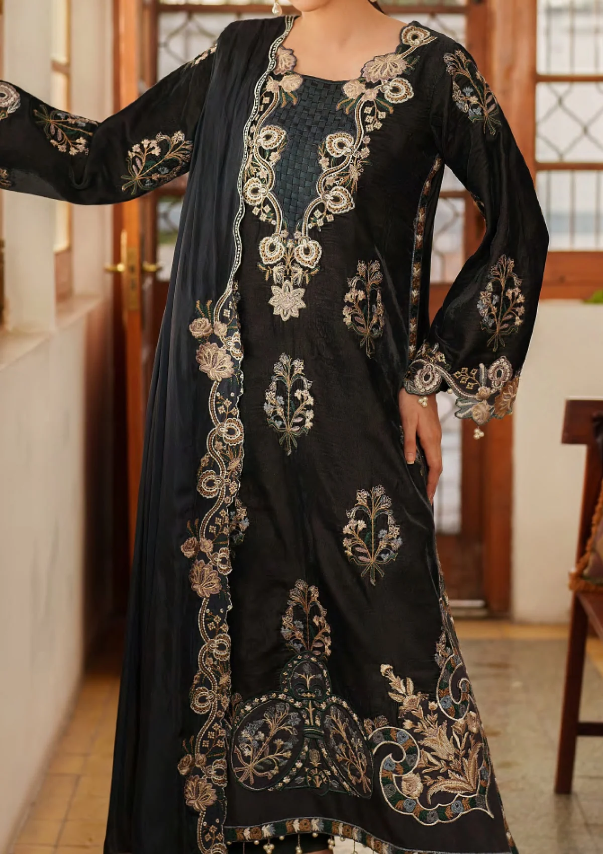 Embroidered patti for daman and hem on viscose.