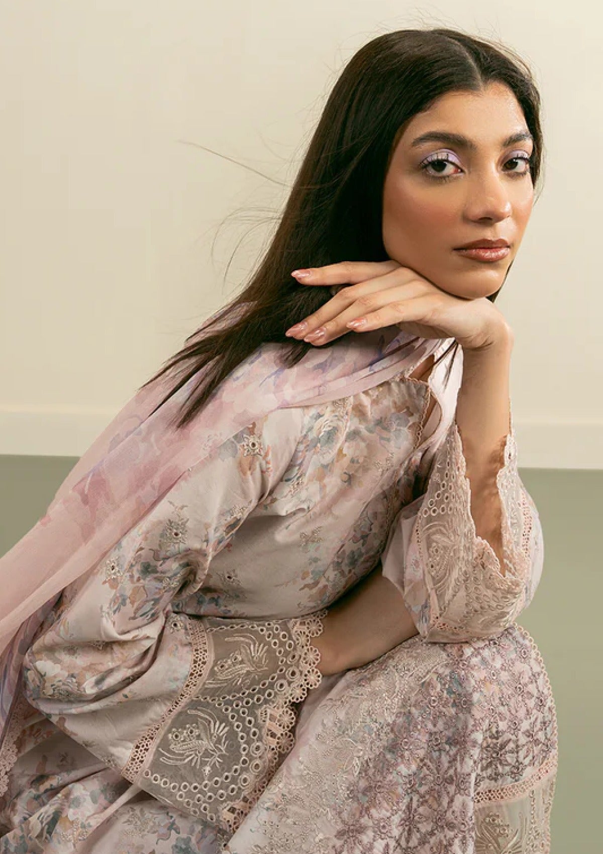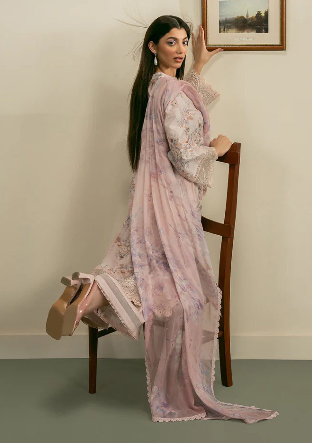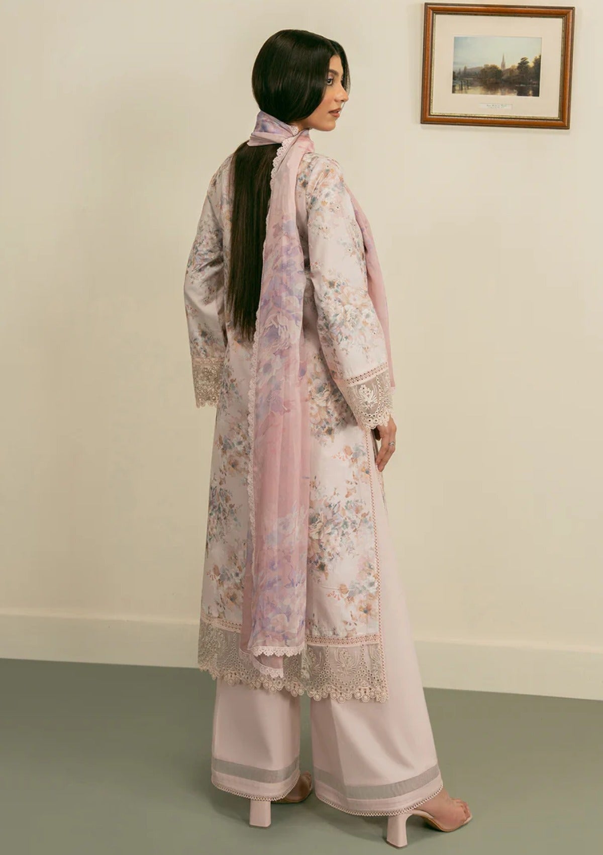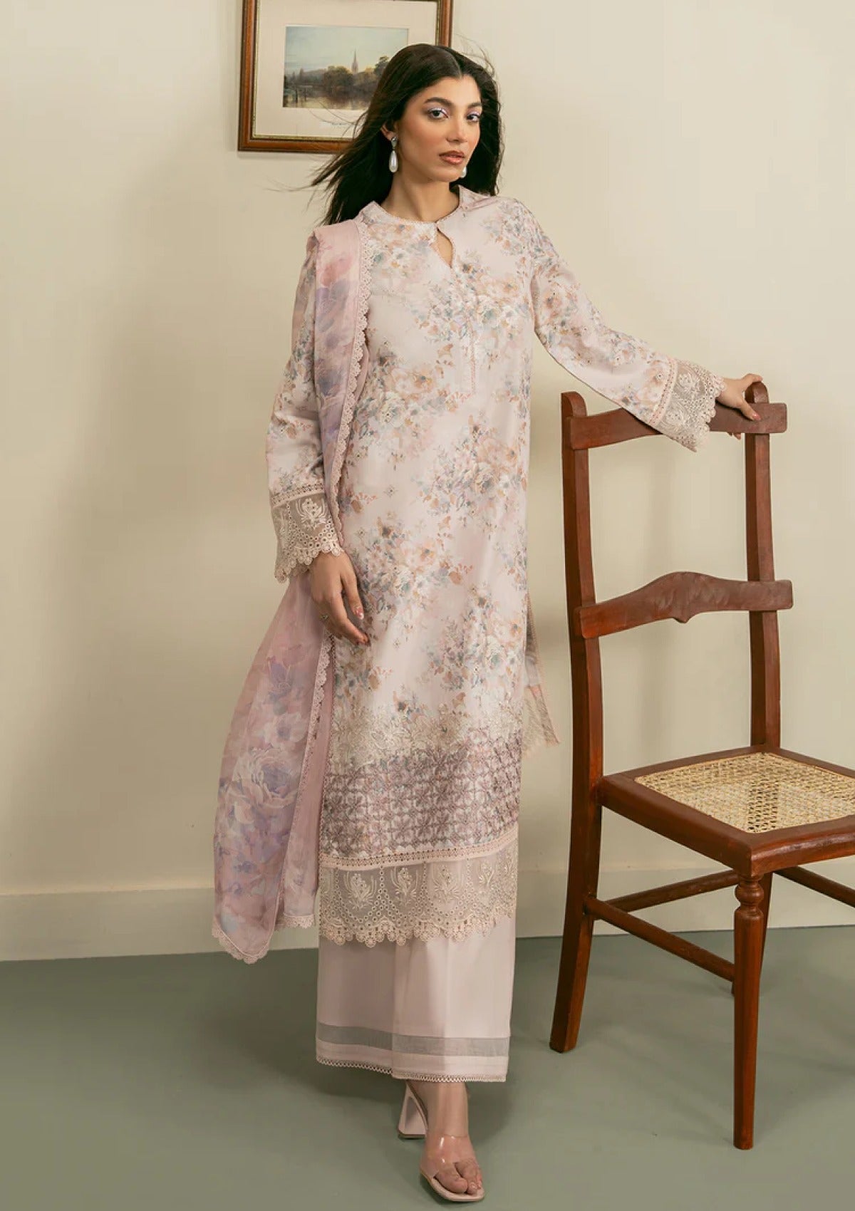 Breathe elegance this summer with a digitally illustrated and delicately embroidered front, paired with a beautifully printed back and sleeves. Embellished borders add a luxe finish, while the airy printed dupatta and soft dyed trousers offer the perfect blend of charms and comfort. An ensemble crafted to keep you effortlessly graceful in every sunlit moment.