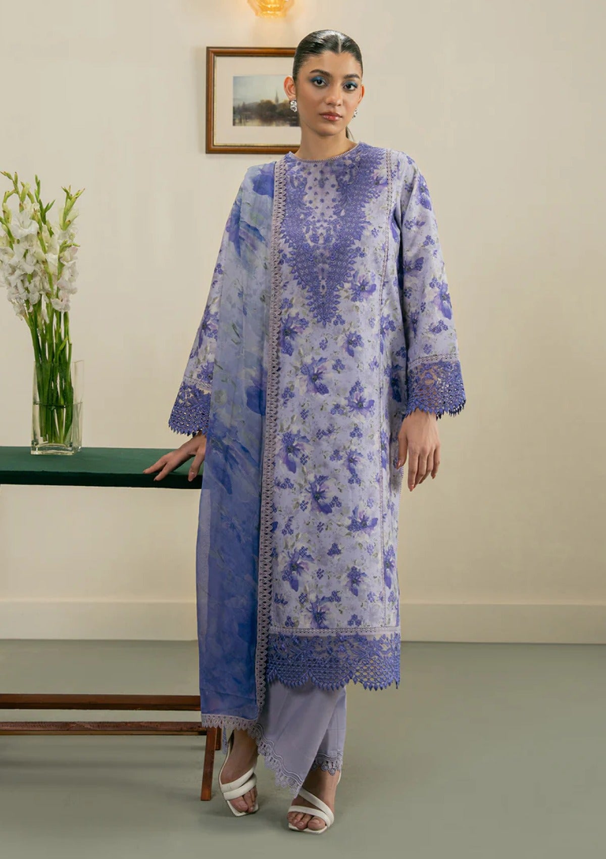 Bask in the beauty of summer with this stunning ensemble. A digitally printed and embroidered lawn shirt paired with delicate organza borders and a statement neckline patch for a touch of luxe. The airy chiffon dupatta adds graceful movement, while soft cotton culottes keep things effortlessly comfortable. A timeless blend of elegance and ease, made for sunlit days.