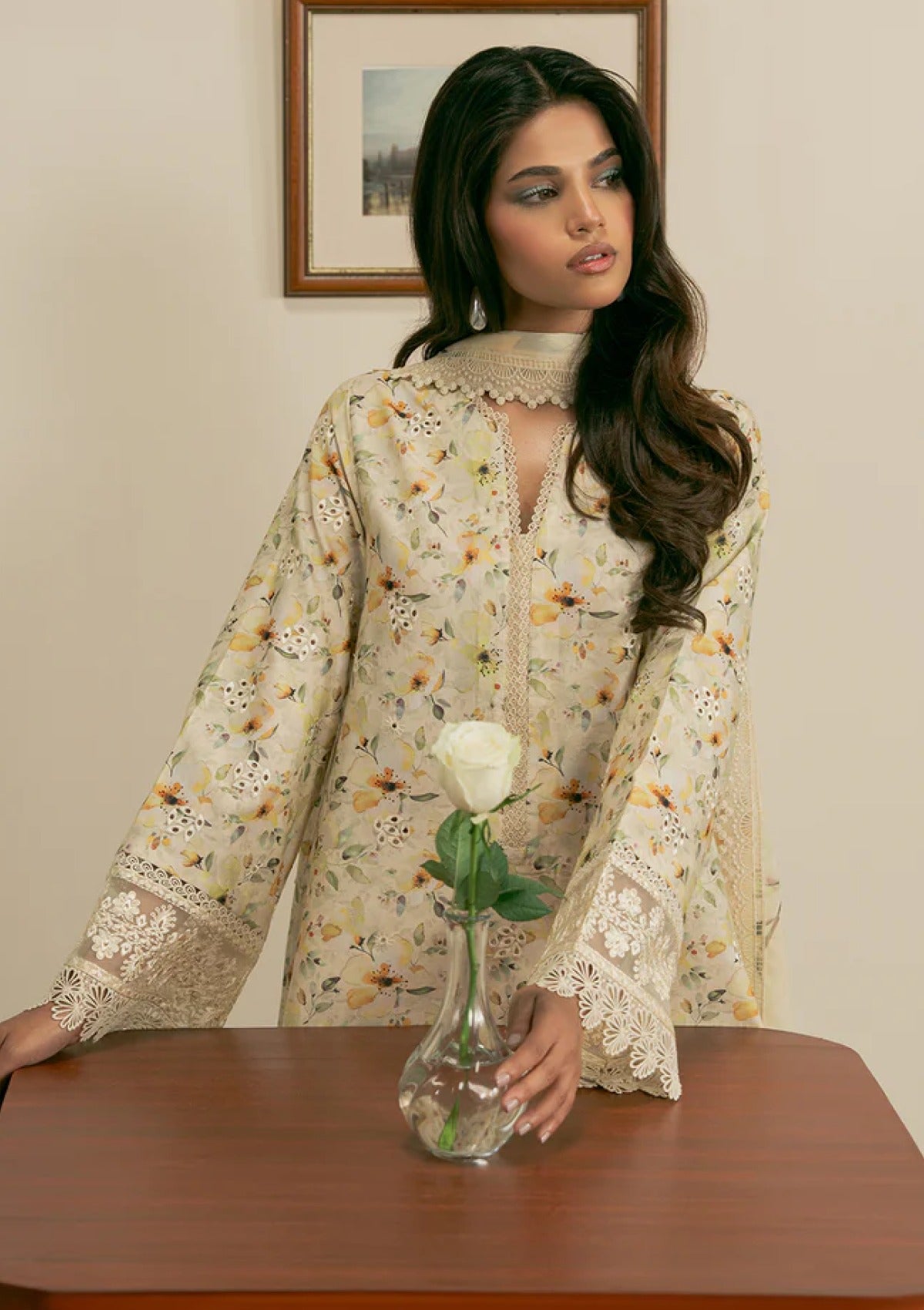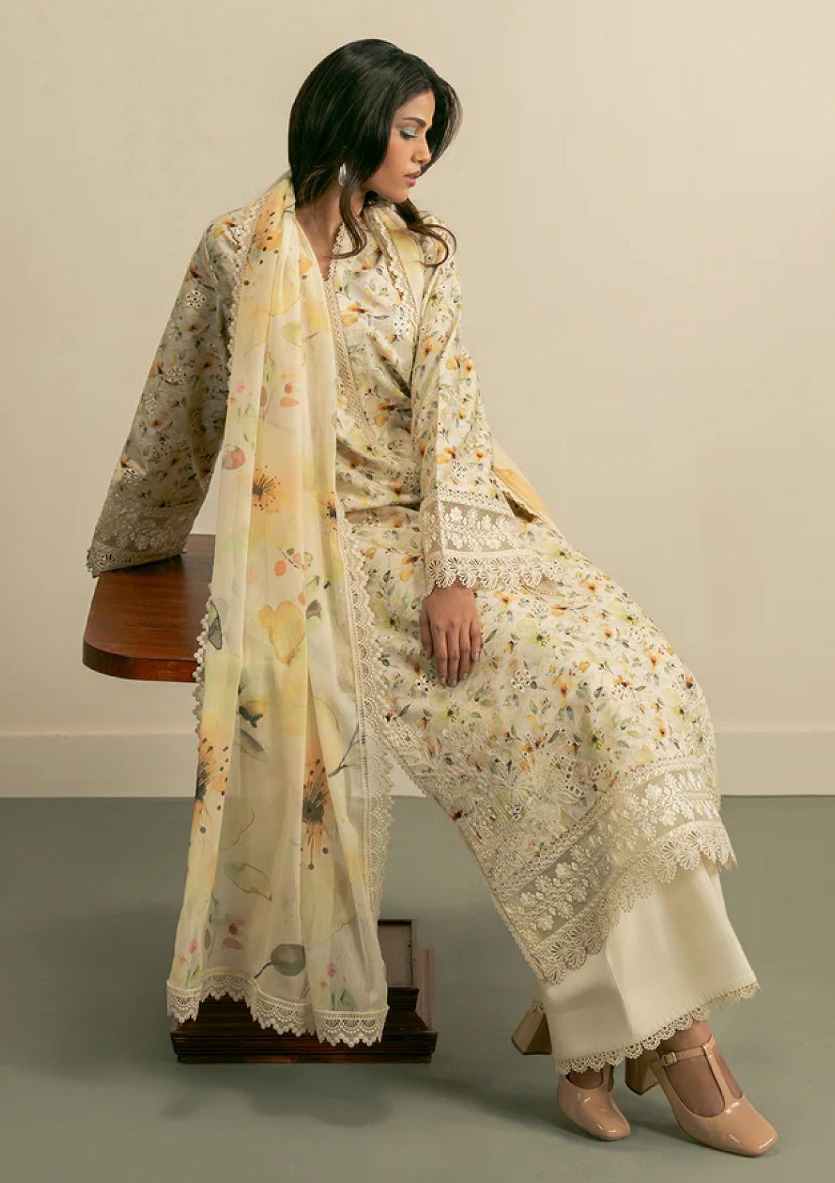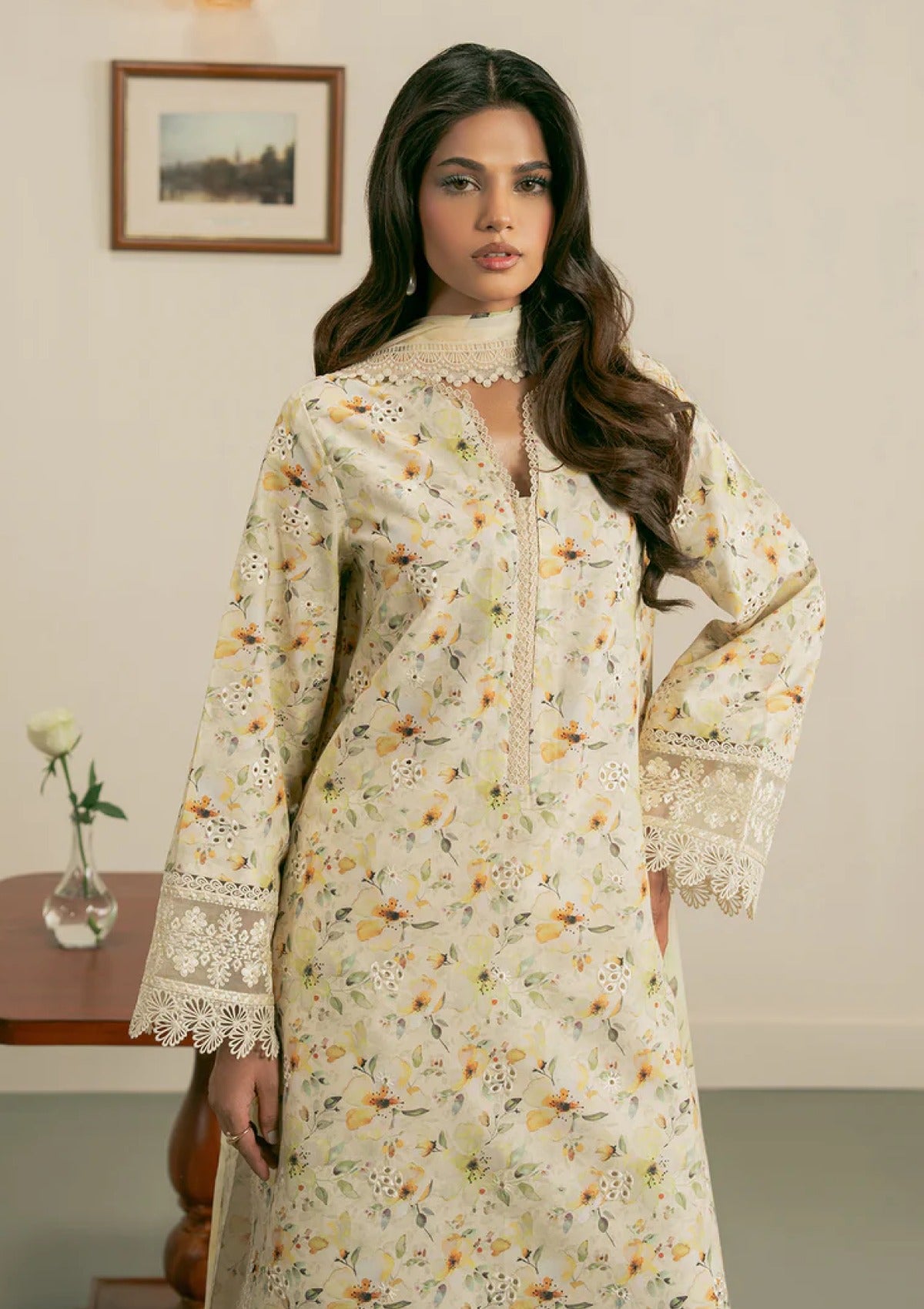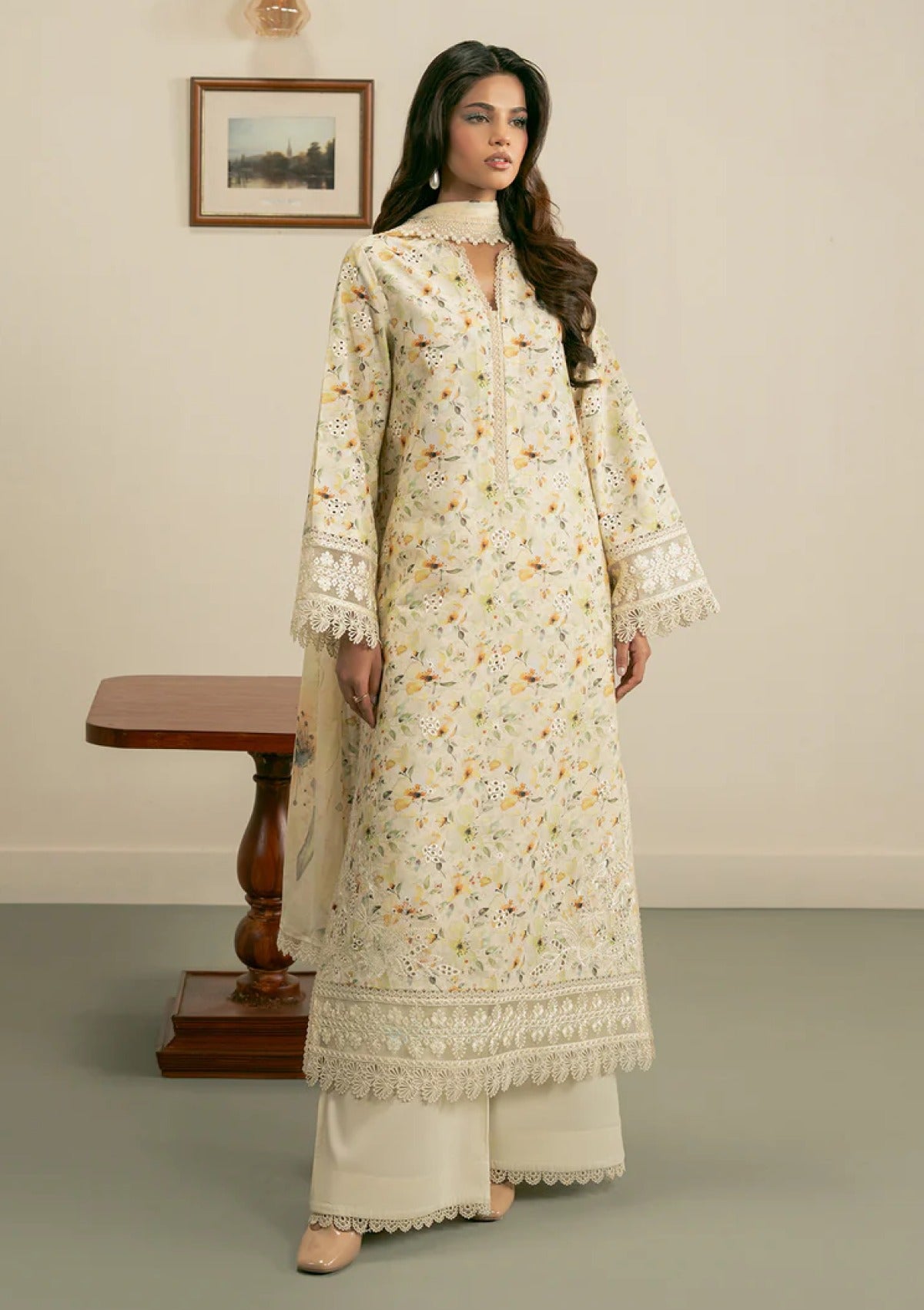 Bask in the beauty of summer with this stunning ensemble. A digitally printed and embroidered lawn shirt paired with delicate organza borders and a statement neckline patch for a touch of luxe. The airy chiffon dupatta adds graceful movement, while soft cotton culottes keep things shiftlessly comfortable. A timeless blend of elegance and ease, made for sunlit days.