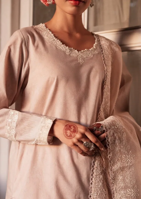 Expertly designed for the discerning fashionista, the ARID SHORE-3 PC PRINTED LAWN SUIT is the perfect blend of style and comfort. The intricately printed shirt, with its embroidered neckline and 40 embroidered patti for sleeves, exudes elegance. Paired with a cambric dyed trouser and a net embroidered dupatta, this outfit is a must-have for any wardrobe.