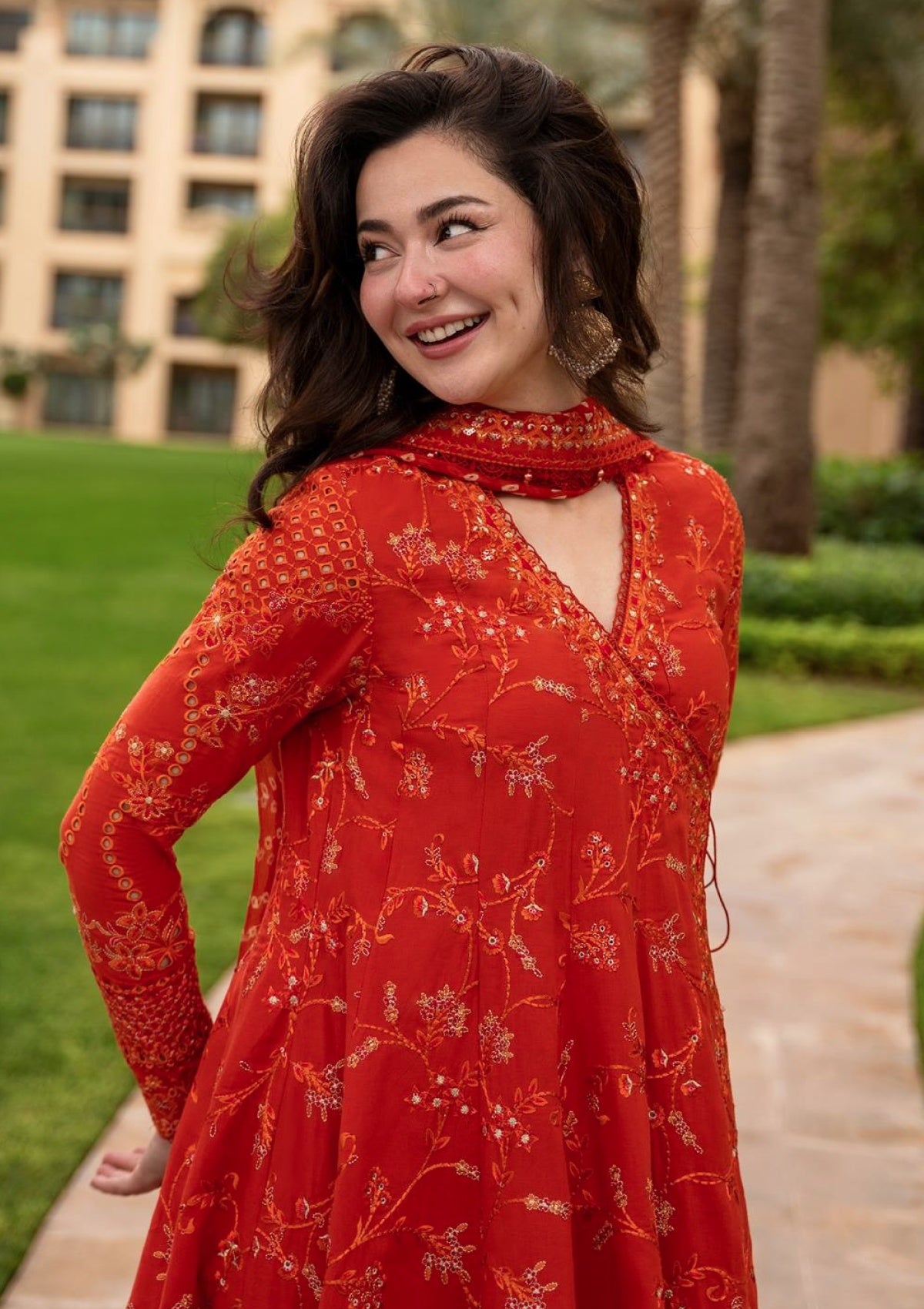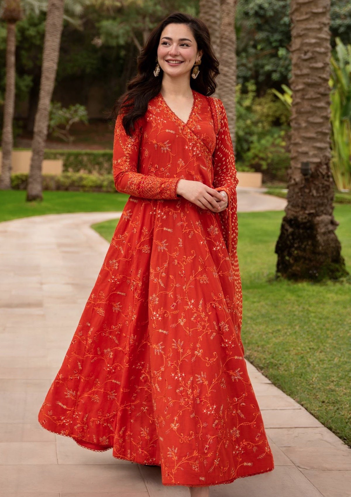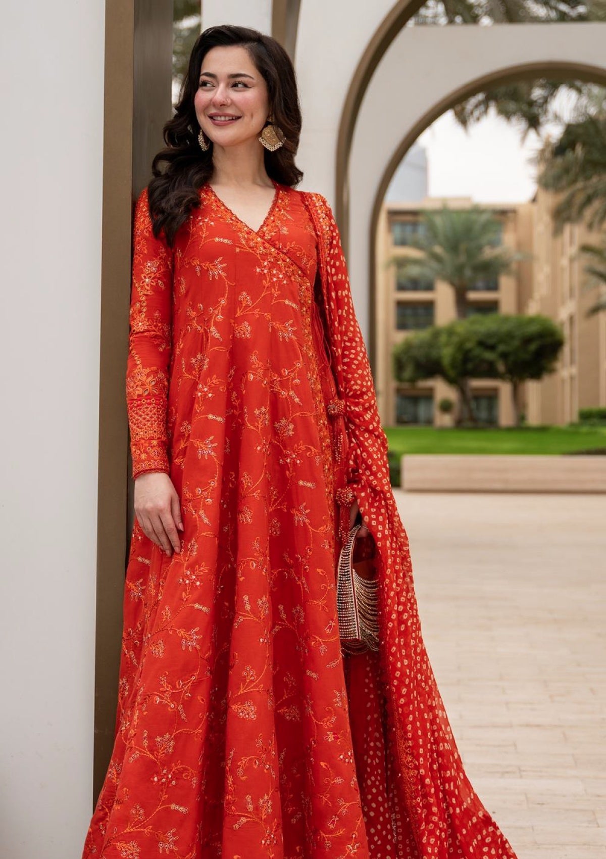 Bathed in timeless elegance and refined charm, Denisa radiates effortless sophistication. Rendered in a vibrant burnt orange hue, the lawn shirt is delicately adorned with intricate embroideries and subtle detailing. Paired with a coordinated lawn bottom and a billowy chiffon dupatta, this set promises to elevate your classic summer wardrobe.