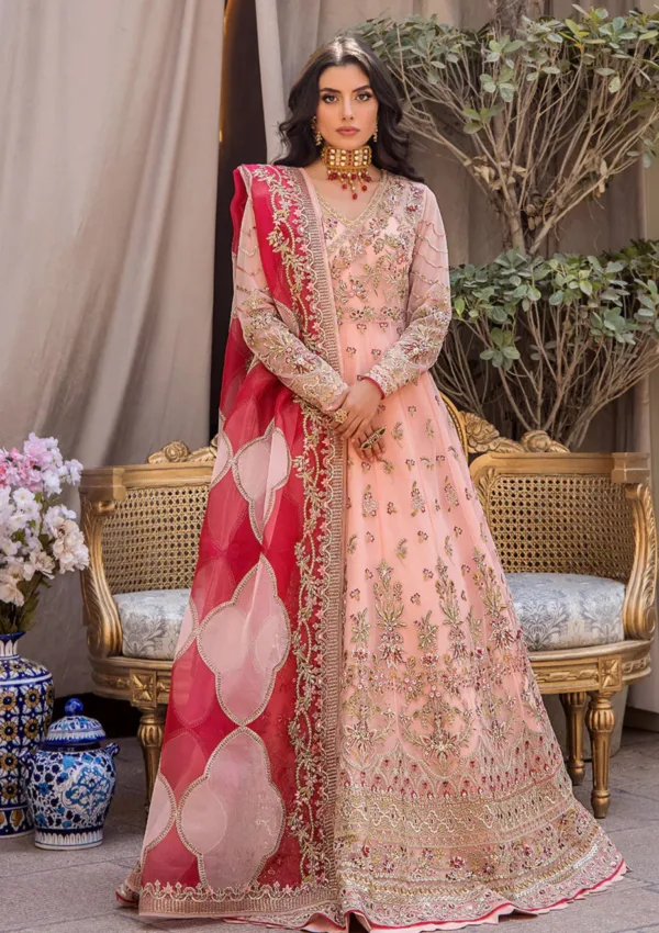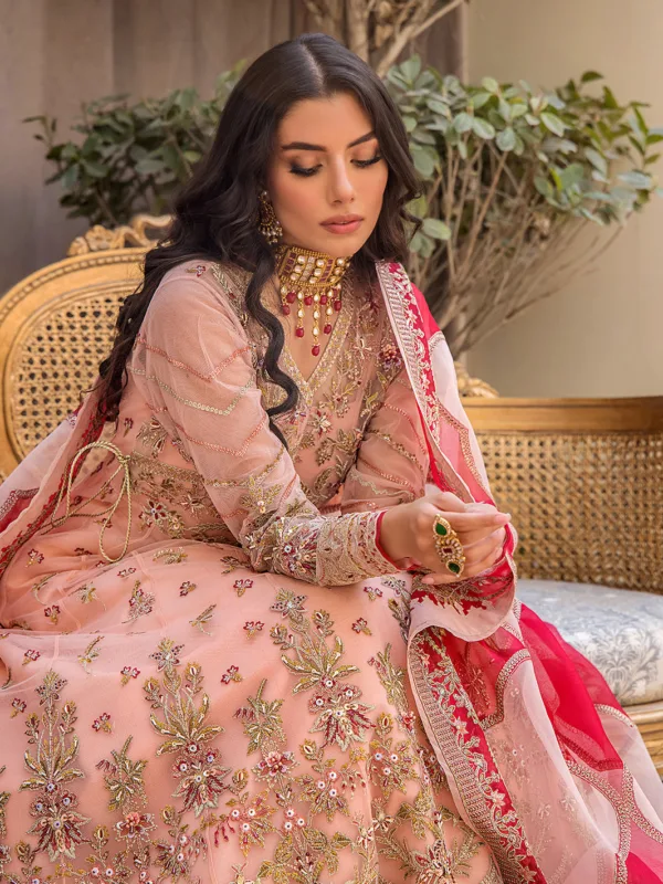 In a subtle shade of peach, presenting a paneled pishwas featuring a delightful display of stunning embroideries and hand embellishments artistically worked all over. The FK signature handmade hanging tassels on the side accentuate the look. Accompanied by a swoon-worthy dual-toned embroidered dupatta crafted on organza and raw silk light to complete the look. This outfit is a true essence of tradition.