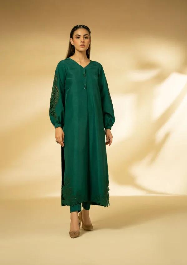 Step into a world of enchanting beauty with “Emerald Symphony . This captivating outfit features a rich Green color, reminiscent of the deep allure of emeralds. Crafted from luxurious Raw Silk, the shirt boasts a front cutline and is adorned with meticulously handcrafted buttons on the front, adding a touch of elegance and uniqueness. The sleeves are a work of art with bold embroidery and cut work details, featuring gathers and cuff sleeves that create an aura of sophistication. The outfit is paired with a Korean Raw Silk narrow trouser featuring embroidered border, ensuring both comfort and contemporary style. |