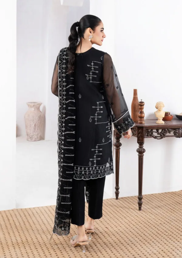 This enchanting 4-piece Black organza set is adorned with delicate silver tilla embroidery. The lightweight and sheer black organza fabric provides a delicate, ethereal quality that complements the shimmering silver tilla work beautifully. The embroidery is intricately detailed with floral motifs and geometric patterns. It has Pk raw silk trouser and inner with chiffon dupatta which has silver tilla embroidery all around borders with detailing. The contrast between the black organza and the radiant silver embroidery creates a striking visual impact, making this ensemble a timeless and versatile choice for festive.