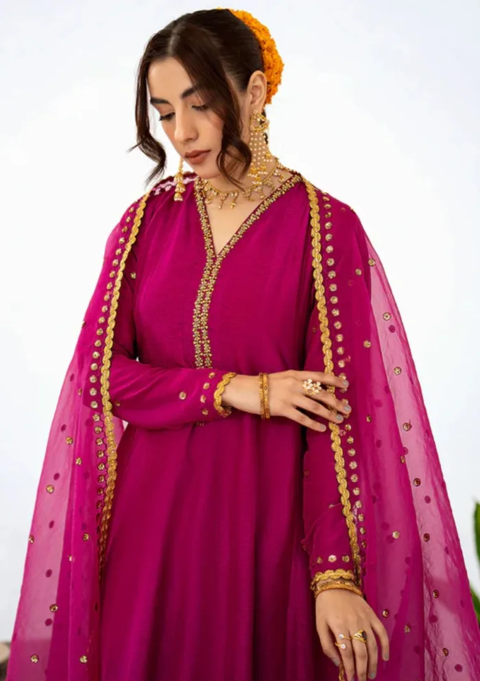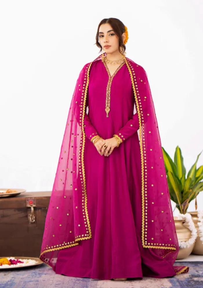 - Daneen – our exquisite magenta silk ensemble. Crafted from Korean silk, this ensemble features intricate adda work neckline and embroidered spray on the sleeves, exuding elegance. Complete your look with the flowy organza dupatta adorned with embroidered sequin spray and tilla lace finish.