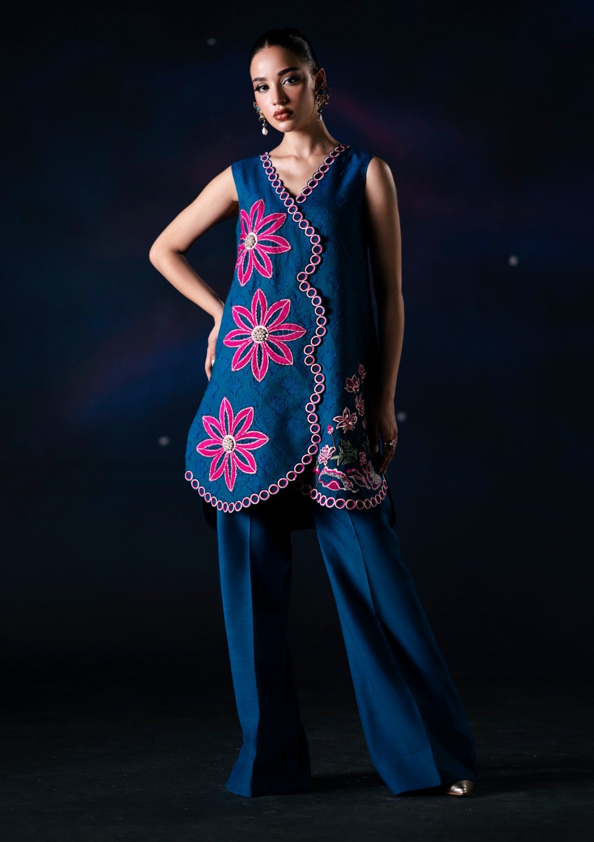 - This striking blue outfit is crafted from textured cotton net, featuring a scalloped shirt design richly adorned with bold embroidery and intricate embellishments. The ensemble is completed with sleek boot cut pants, offering a modern silhouette that perfectly balances the classic elegance of the detailed craftsmanship.