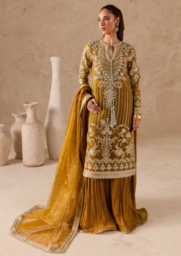 This luxurious dress is a breathtaking blend of tradition and elegance, featuring intricate Dabka and Naqshi work that highlights its rich craftsmanship. The Kashti and Bethki work add layers of refined detail, while the luminous Pearls and delicate Drops bring a touch of sophistication. Sparkling Glass Moti, Sitara, and Japanese Cut Dana create a captivating shimmer, beautifully complemented by the Surahi and Kulfi embellished work. This dress is a perfect choice for any grand occasion, embodying timeless beauty and luxury.