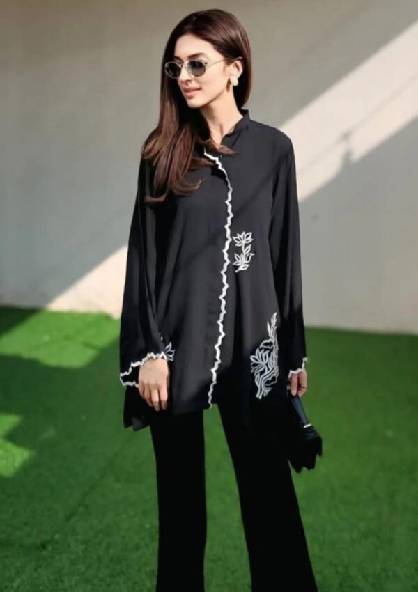 Shirt/Kameez: Stitched according to the design shown. Please note that styles such as crop tops, dropped shoulders, low necklines, backless designs, and three-quarter trousers are adjusted modestly. Lining is provided with all transparent fabrics. - Bottoms: Tailored in line with the product image and design style.