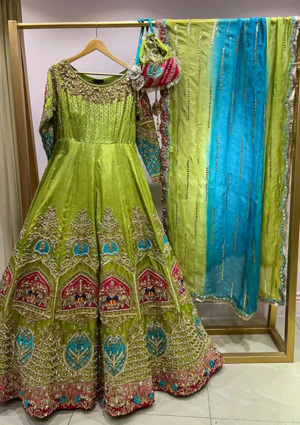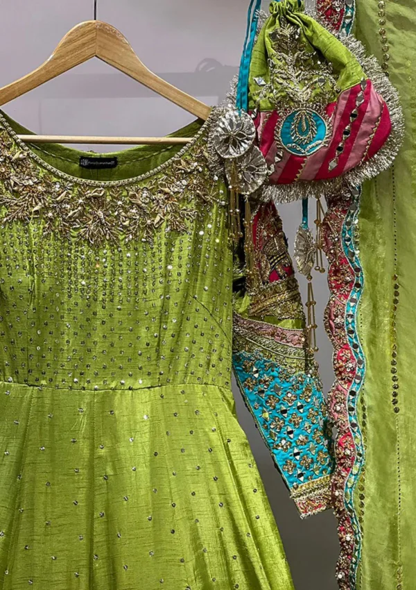 This beautiful dress “Jahanara” so perfectly defines elegance and grace. The marvelous golden tila and sequinned details all over the dress, with the colorful printed patches make this a perfectly refined lehenga choli outfit, ideal for this season’s needs and occasions. It represents the vitality of the summer season and gives off a joyous and wonderful vibe of its own.