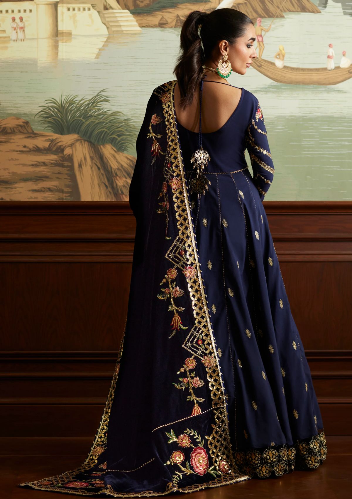 The perfect pishwaas for wedding season! This gorgeous pishwaas features a Loomed Silk body with ornate floral embroidery on the bodice and the sleeves and a luxe velvet border. The outfit is completed with a contrasting black luxe velvet shawl with bold floral details in gold.