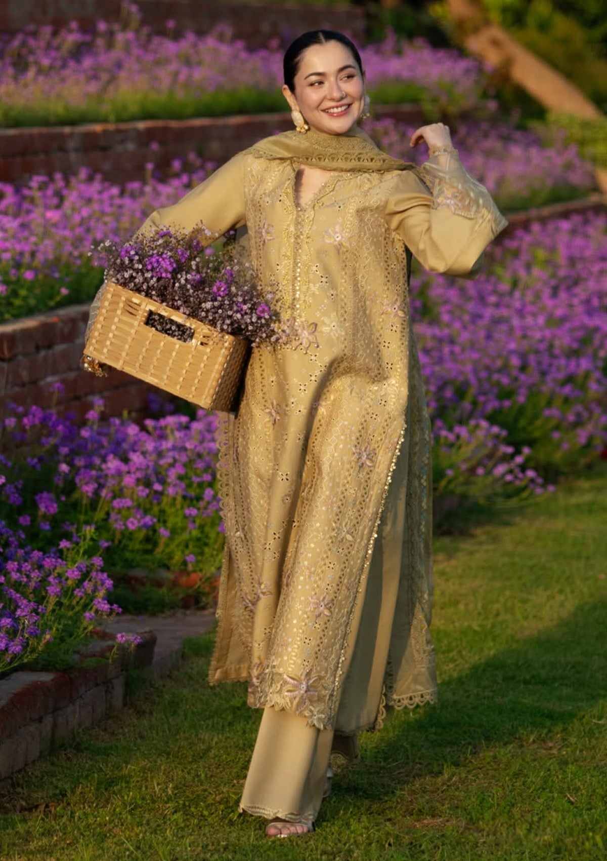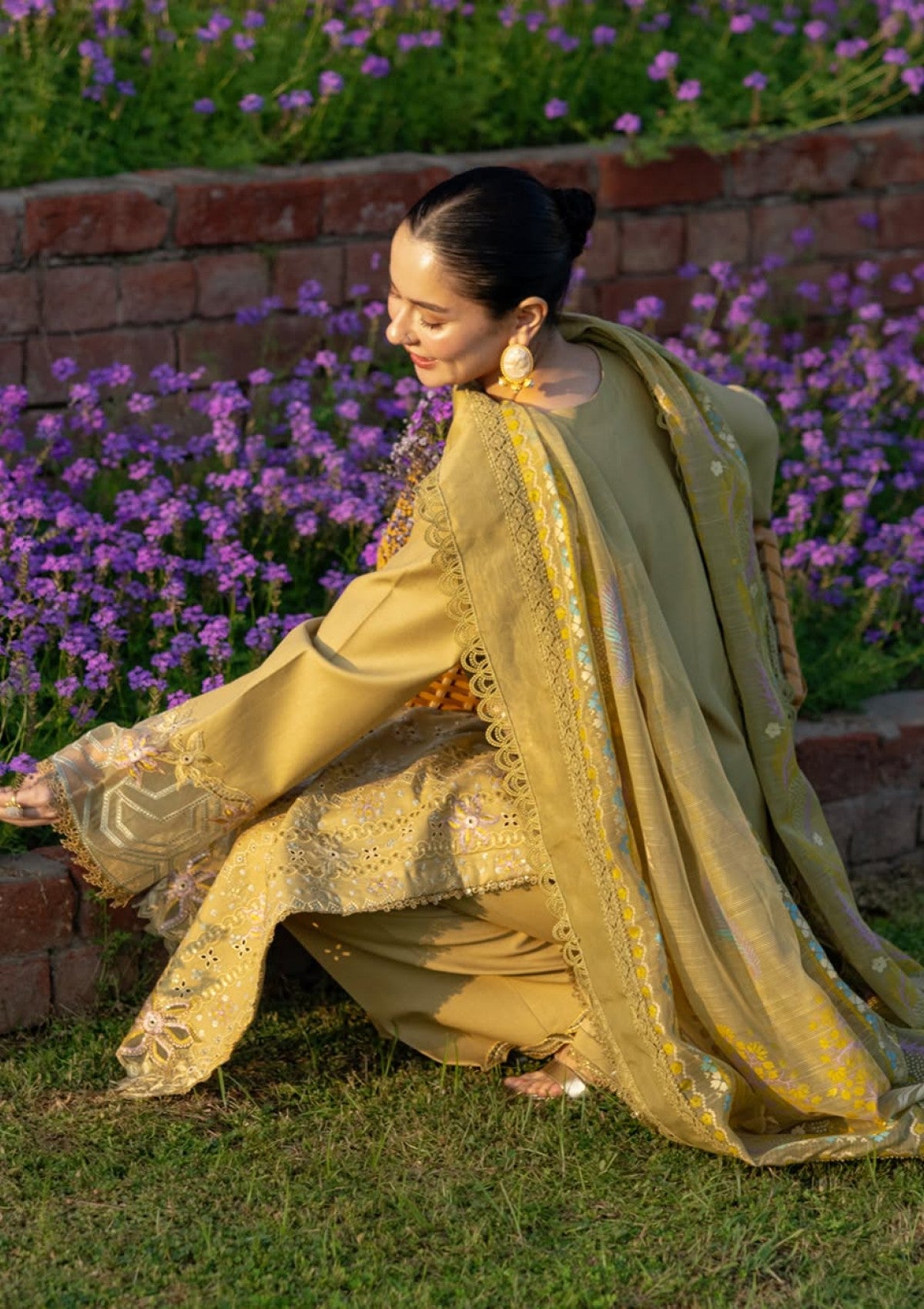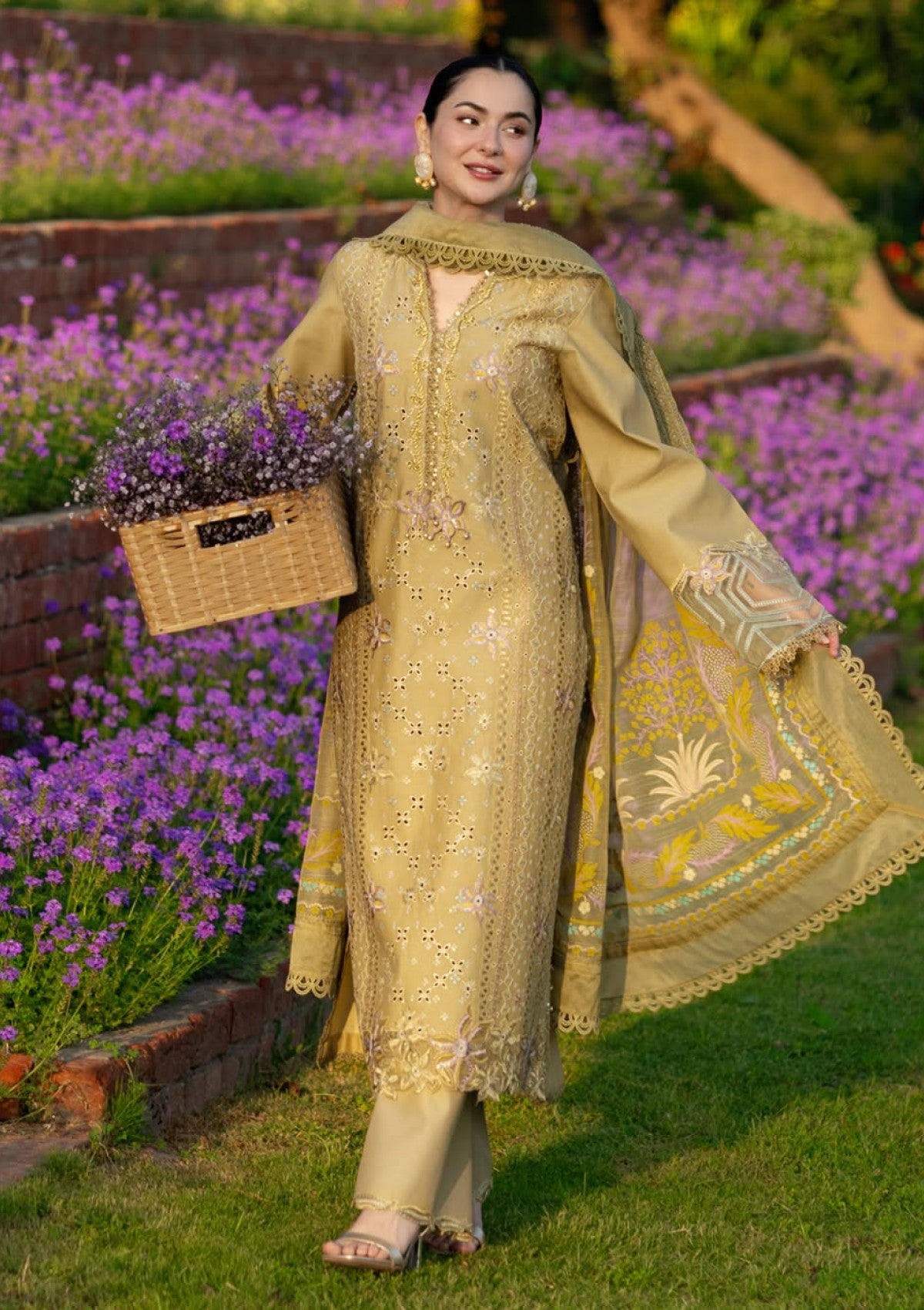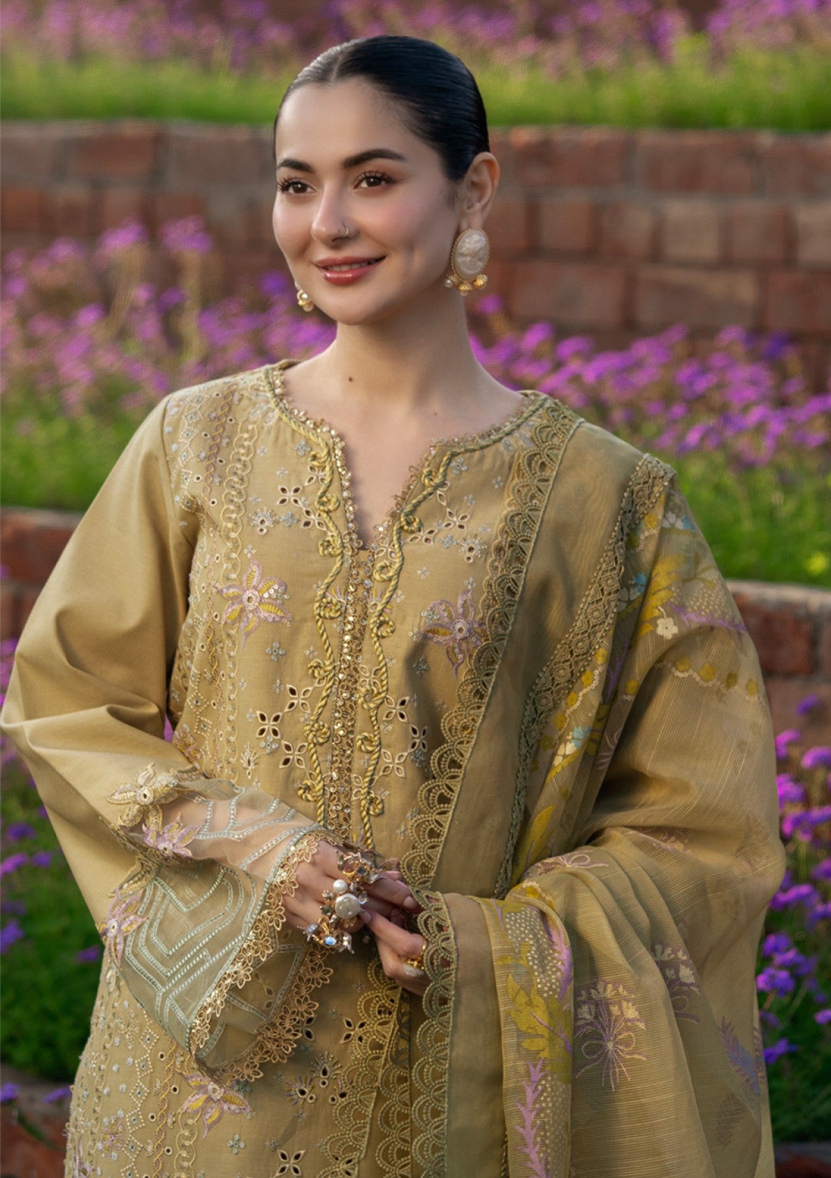 ‘RAHA’ a stunning Cardamom hue that radiates sophistication. Featuring delicate Chikankari embroidery on the front, sleeves, and borders, with intricate neckline details adding the perfect touch. Paired with a luxurious jacquard weaved Hand Painted dupatta and a plain trouser, this outfit is the epitome of timeless beauty. If you’re searching for effortless elegance, look no further.