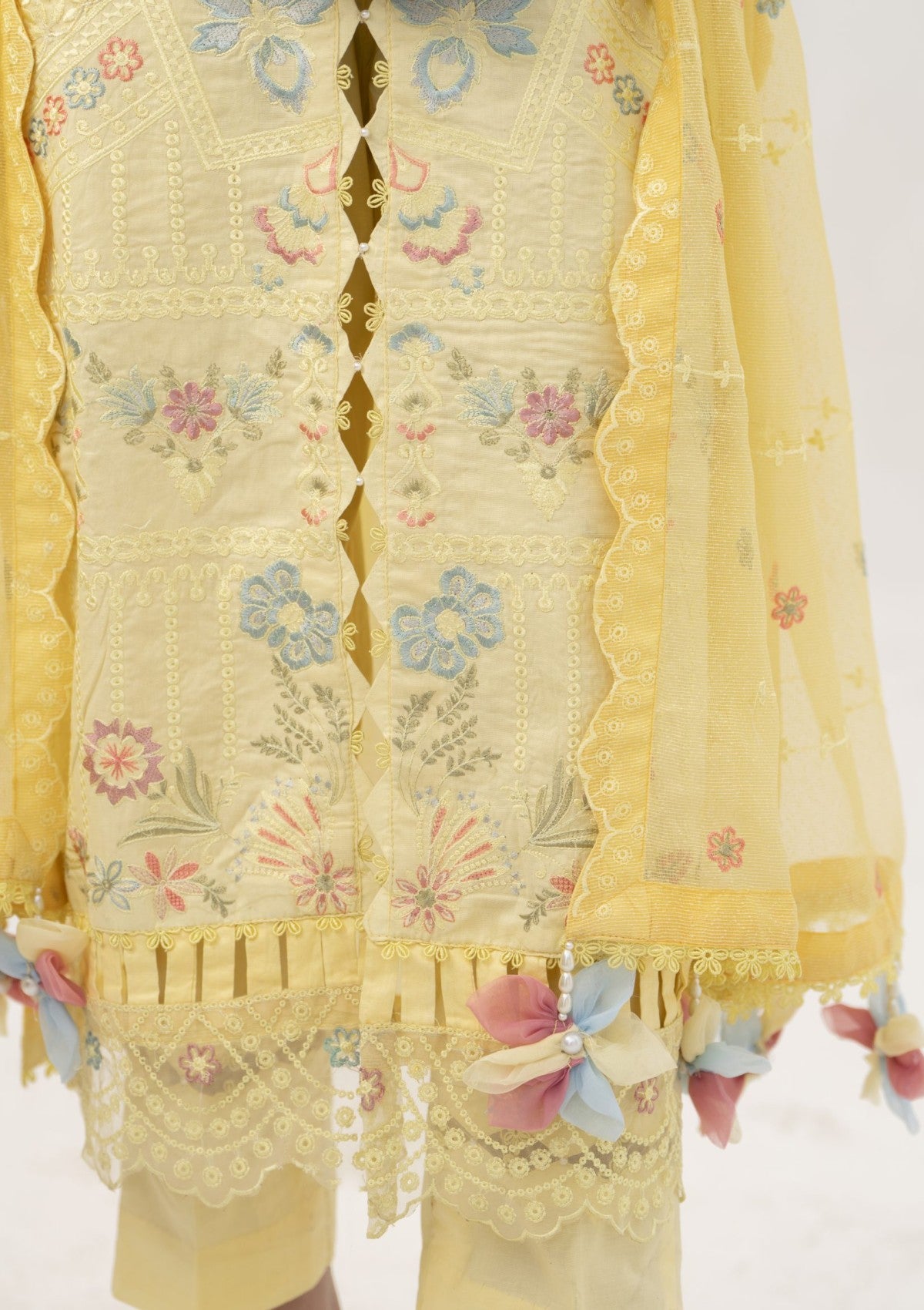 - Dupatta: Finished and accessorised to match the design shown in the images.