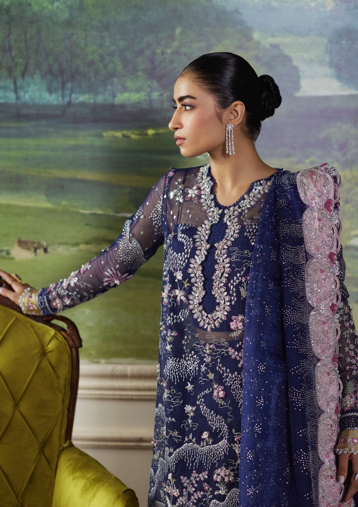 - Stella dazzles in a majestic navy blue hue, adorned with intricate sequins waves that sparkle with every movement. A soft pink satin hem border adds a touch of vibrancy. The dupatta features embroidery in soft pink, coral, and lime shades, elegantly complemented by sparkling diamantes spray for added opulence, addition to it is a satin four sides border that make it culminating in a look that exudes timeless elegance and make it.