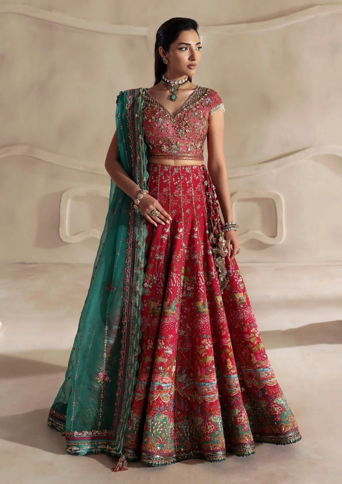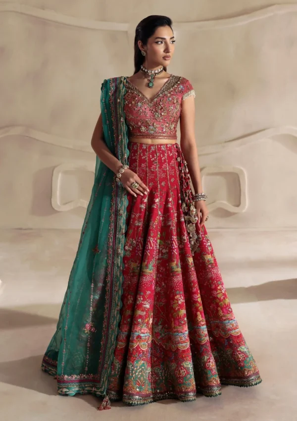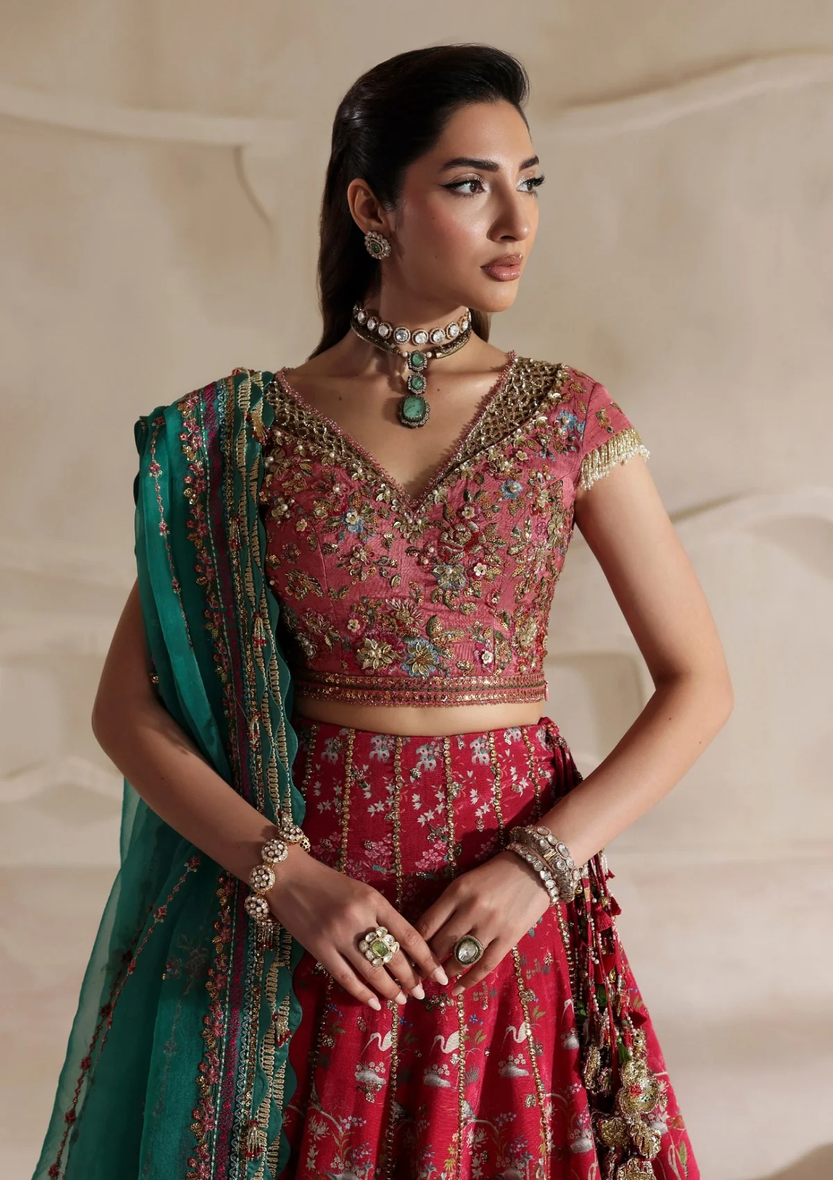 Radiant in hot pink raw silk, this lehenga celebrates festive charm with a bold yet graceful spirit. The shikargah inspired blouse dazzles with intricate adda work where muted rosewood florals bloom across the bodice, kissed with golden sequins that shimmer with every movement. The neckline framed in an ornate gold jaal, lends a regal aura to the silhouette balancing the vibrancy, a contrasting teal dupatta cascades in harmony, adorned with vertical floral vines and delicate detailing for depth and dimension A true ode to heritage and craftsmanship, this ensemble blends bold color play with timeless artistry designed to leave an unforgettable impression