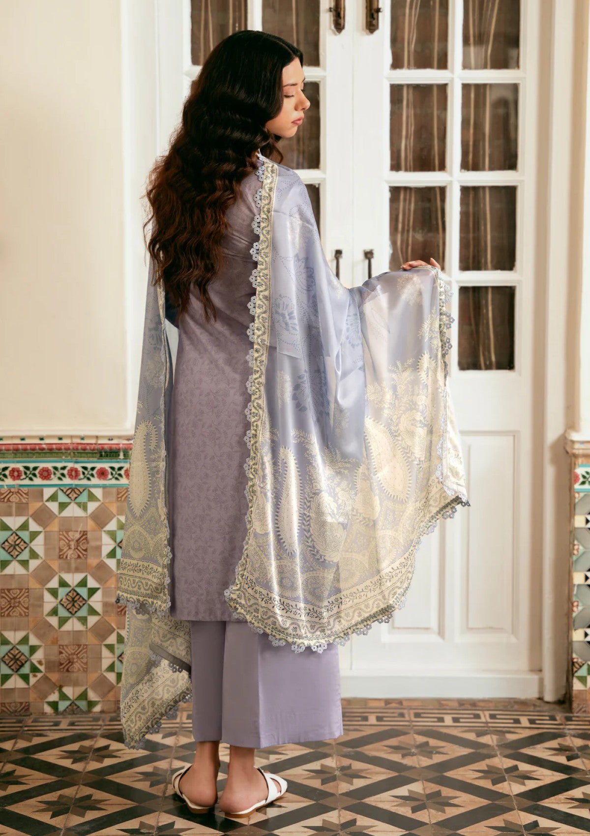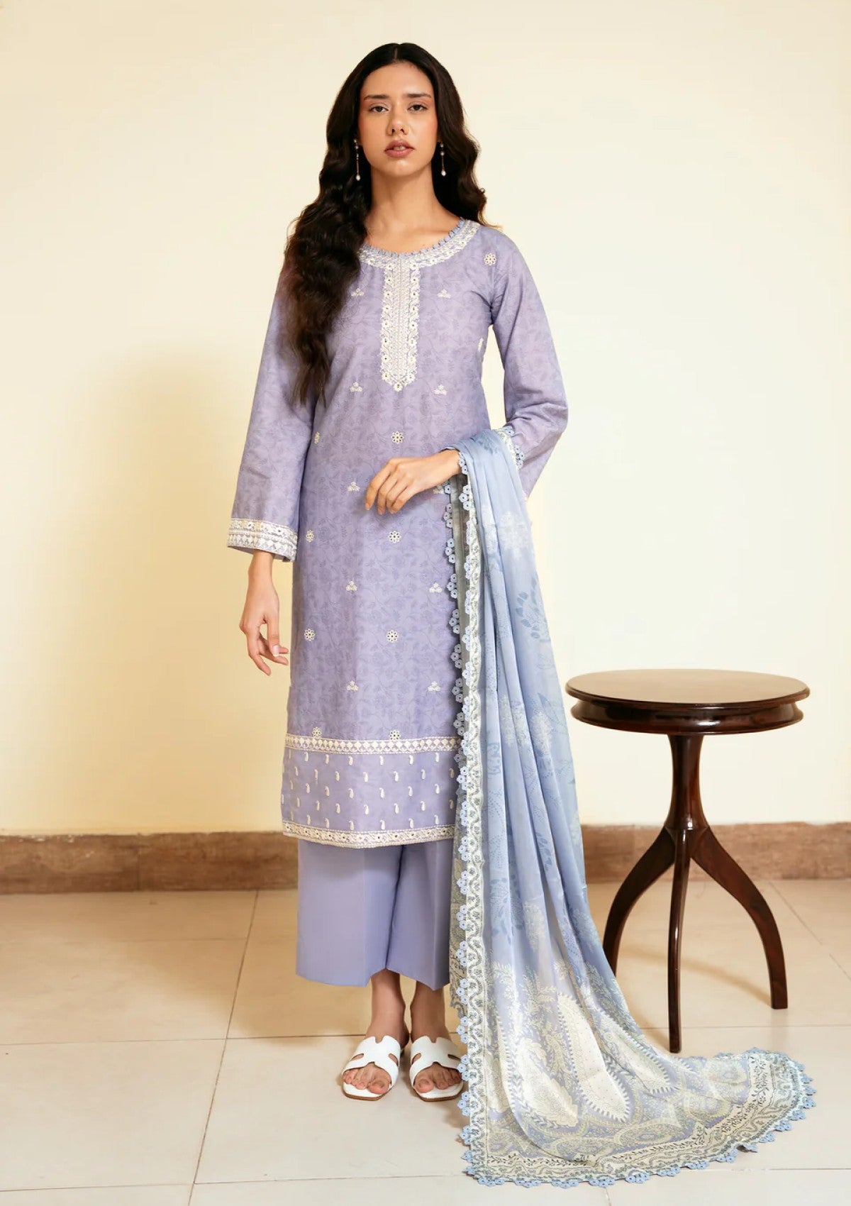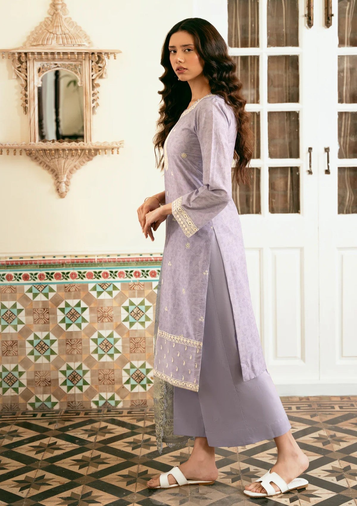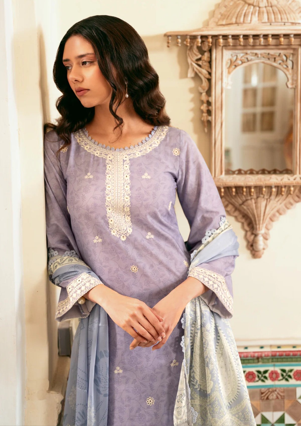 The shirt carries a printed soft lavender base with delicate embroidery along the neckline, sleeves, and hem, paired with a dyed lavender trouser. A contrasting powder blue silk dupatta with paisley prints.