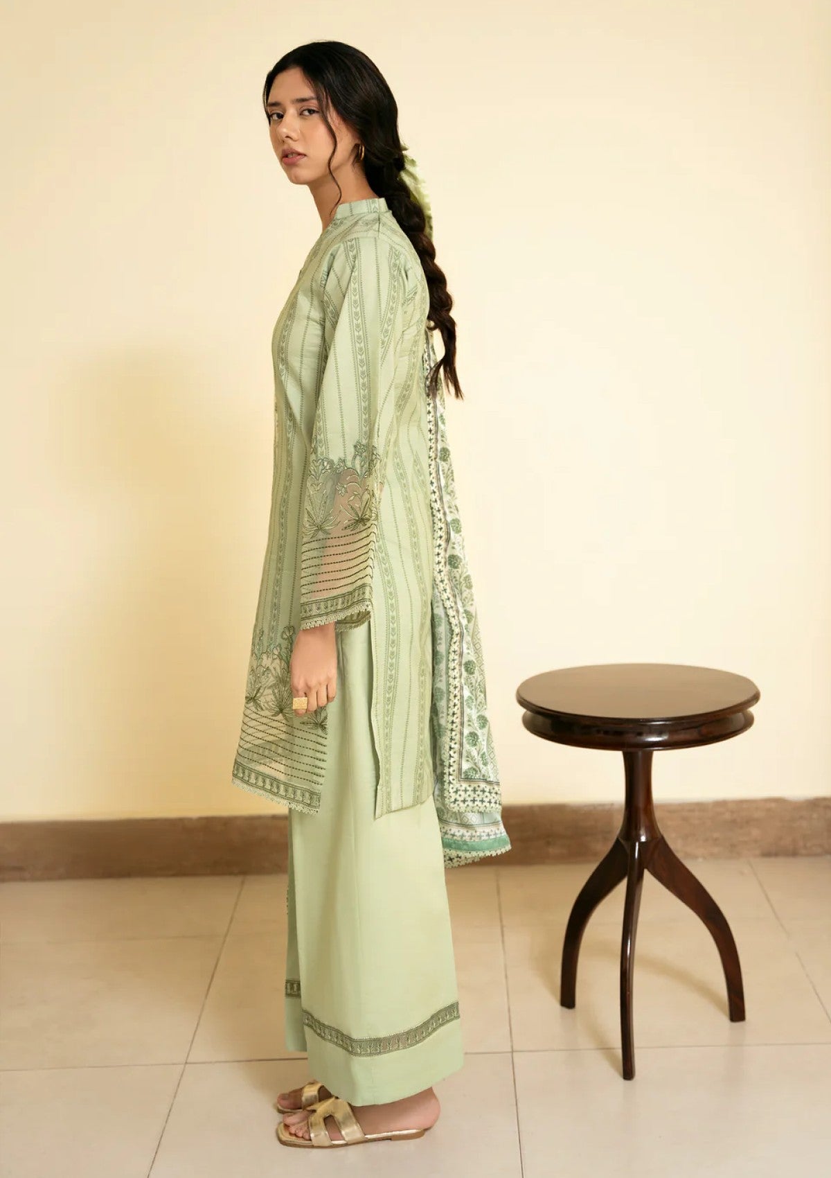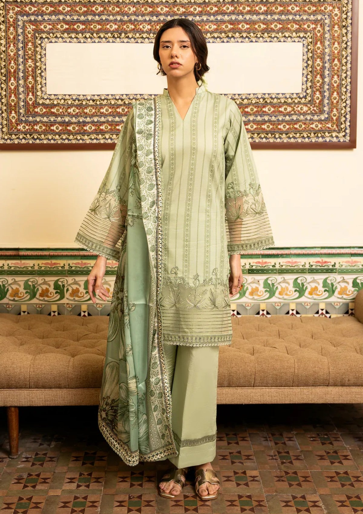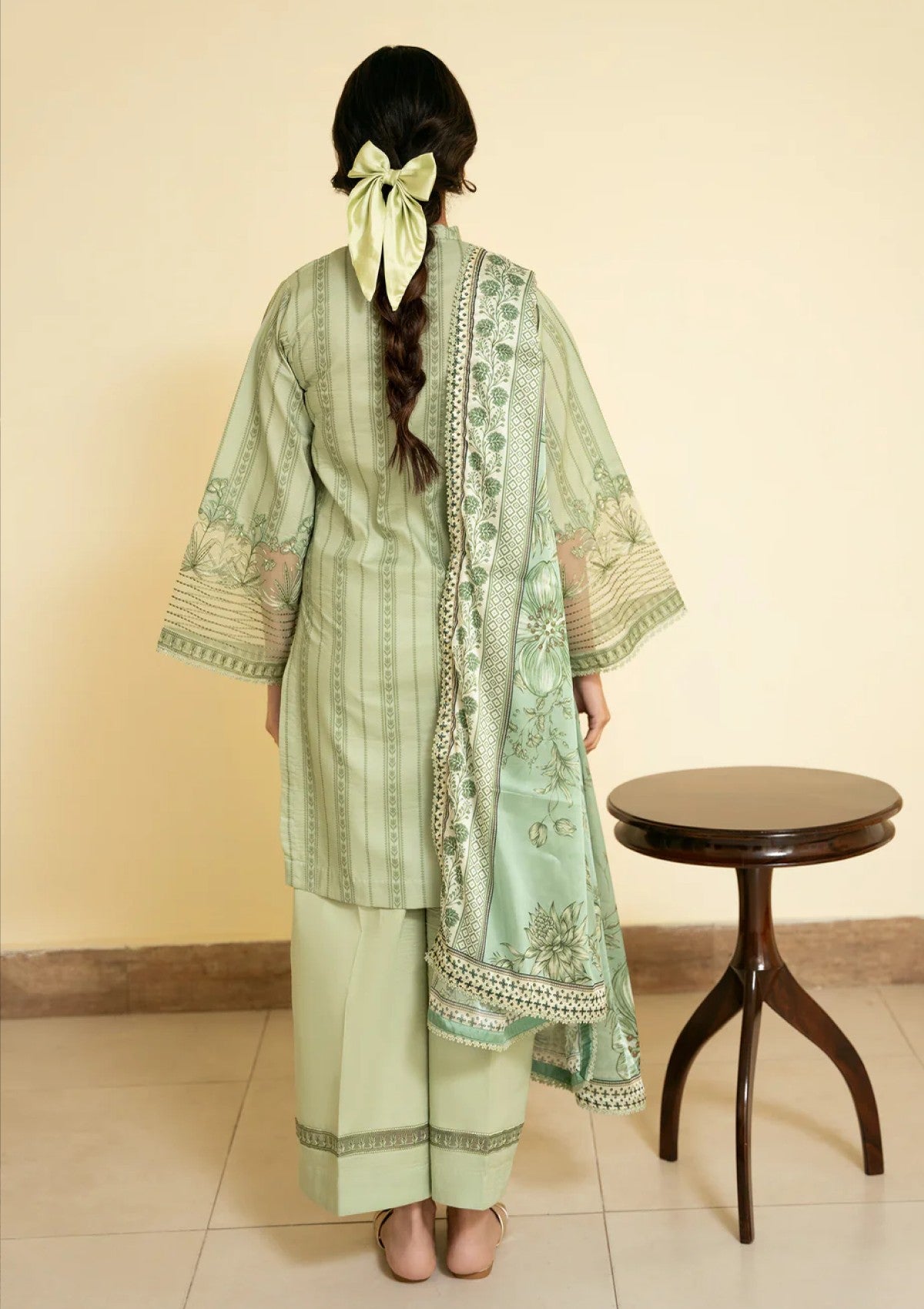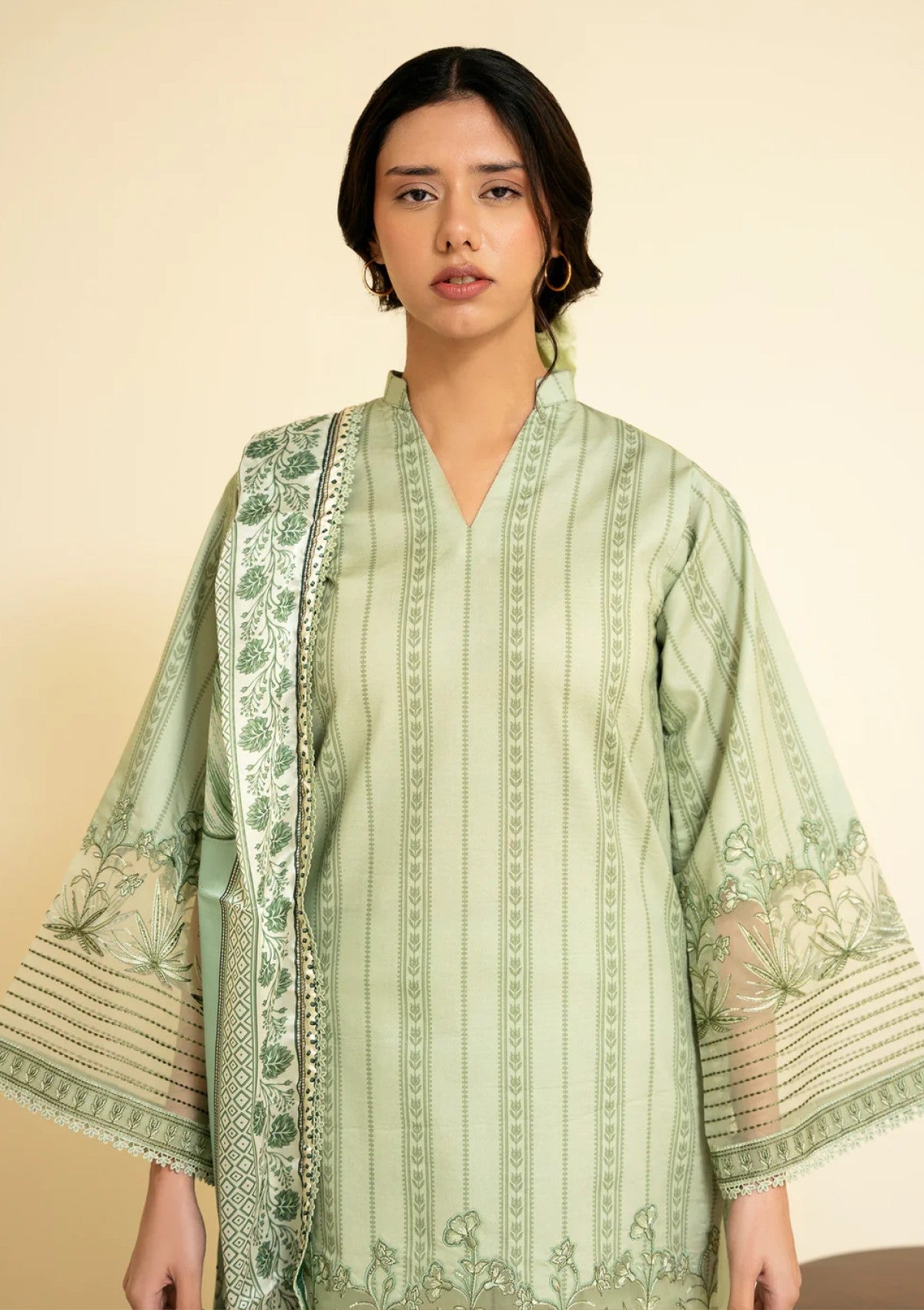 The dupatta features a sage silk base adorned with oversized botanical florals and framed with intricate printed borders. The shirt carries a vertical vine inspired printed pattern in muted green tones, finished with a detailed embroidery patch along the sleeves and hem. Dyed trouser with an embroidered border at the hem.