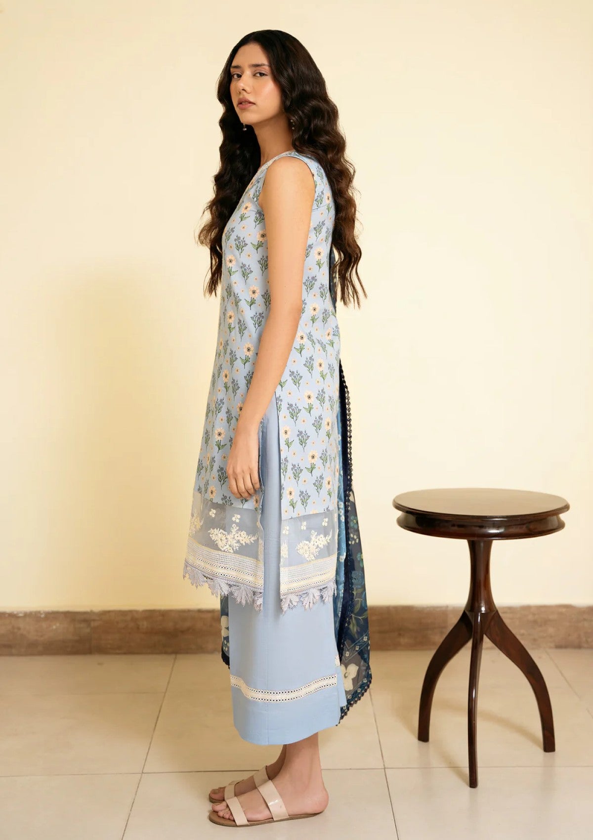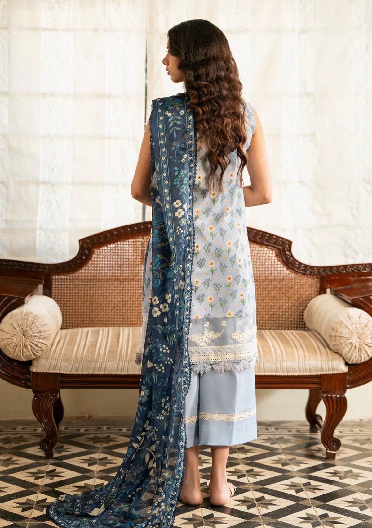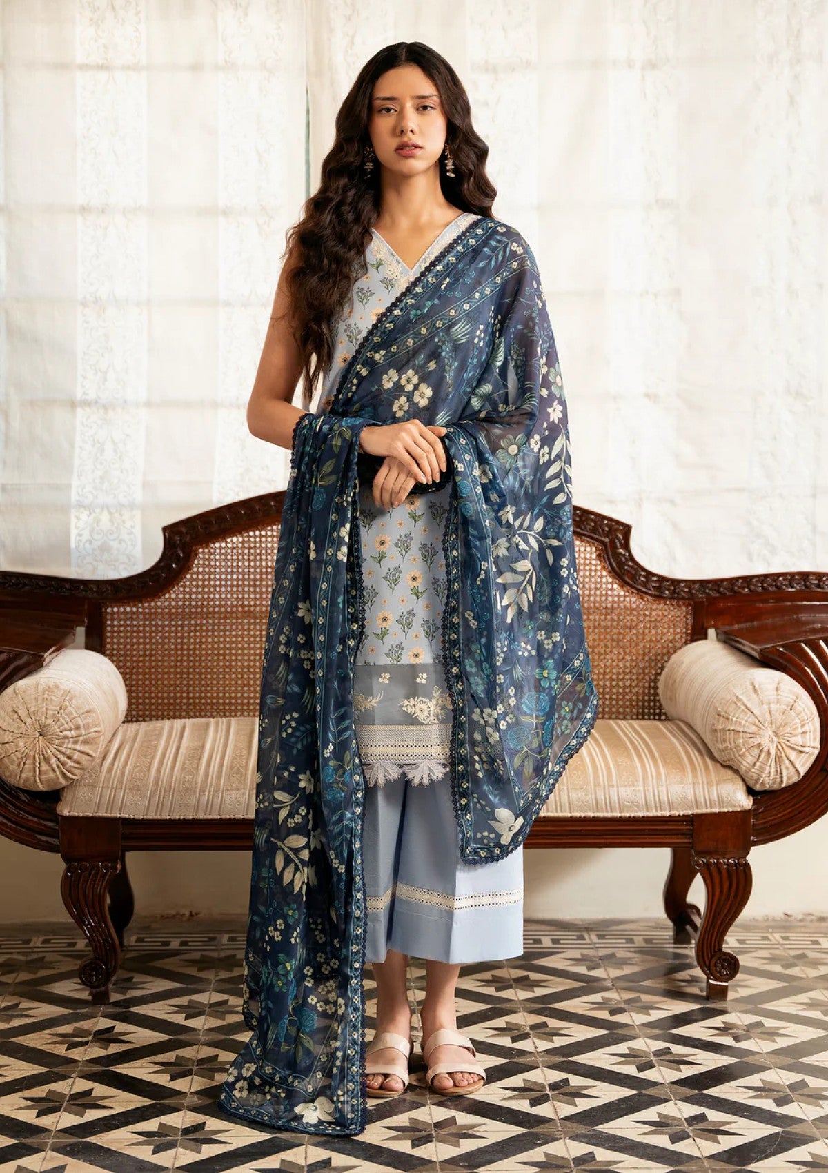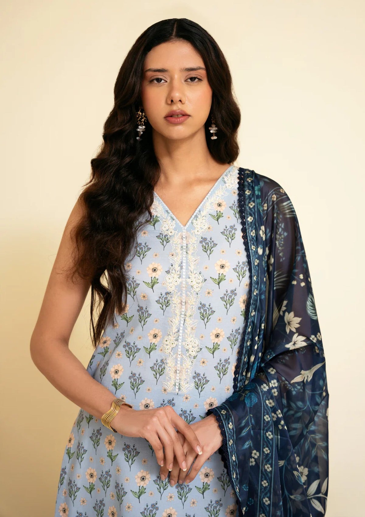 The dupatta features a deep blue silk base adorned with delicate floral motifs, framed with detailed printed borders that add contrast and definition. The shirt carries a powder blue printed base scattered with small floral elements, enhanced with intricate embroidery along the neckline paired with dyed trouser.