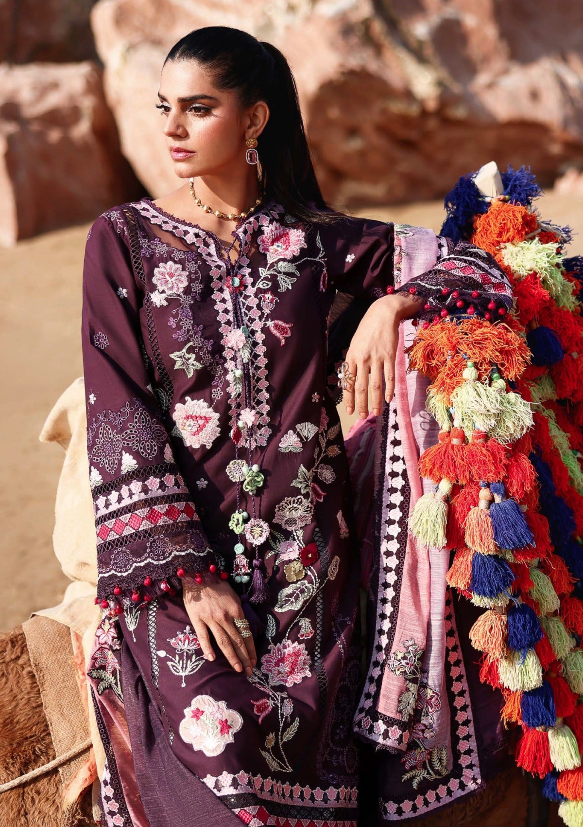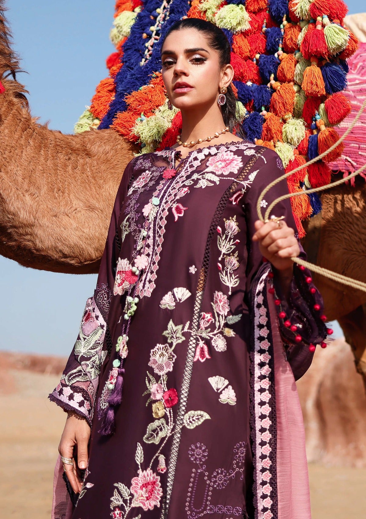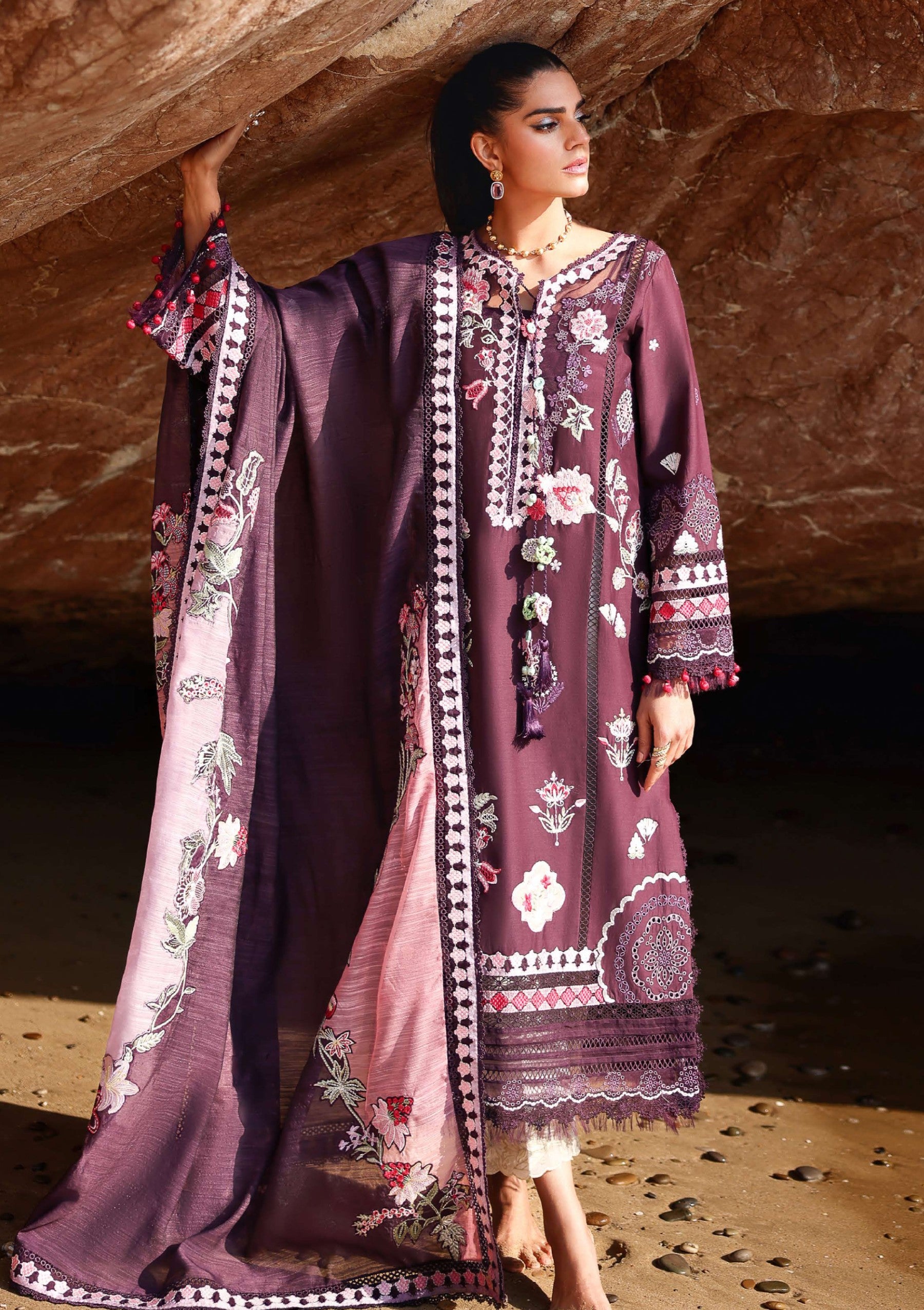 A fearless tribute to heritage, this striking ensemble commands attention with its ecanvas —deep purple, bold, unapologetic, and deeply rooted in tradition. Intricate floral motifs bloom across the surface in soft blush, primrose yellow, and crimson, meticulously accented with fine ivory chawal tanka topstitching. Delicate Schiffli details in amethyst and mauve drift across the fabric, while appliqué jharokas and subtle Moroccan-inspired motifs cut through the design like echoes of ancestral rhythm, honoring time-honored artistry. At its heart, the piece reimagines the legendary Ralli craft of Sindh — where vivid appliqué meets contemporary design in a daring fusion of heritage and modern edge. The look is completed with a striking deep purple monar dupatta, asymmetrically color-blocked in tones of blush and lavender. Floral vines grace the pallu, while all four sides are framed with embroidered geometric borders, adding structure and refinement. This is more than an outfit — it is a powerful expression
