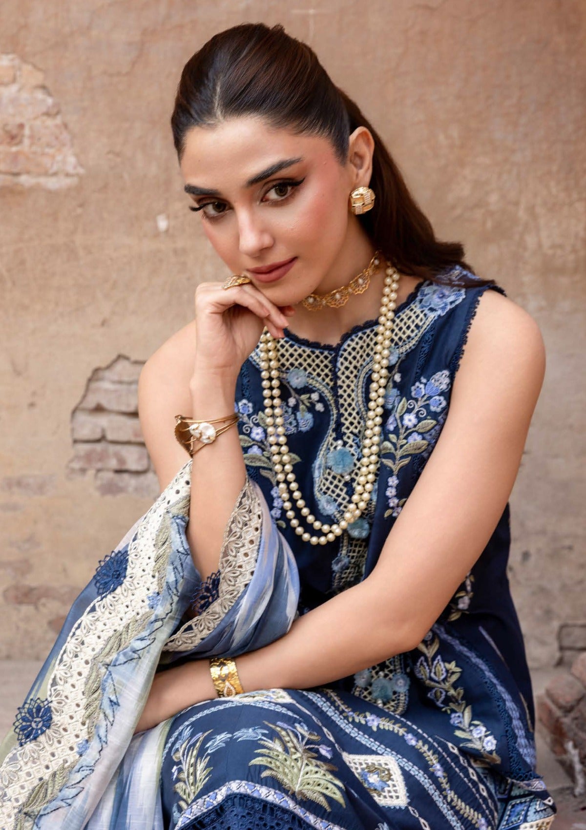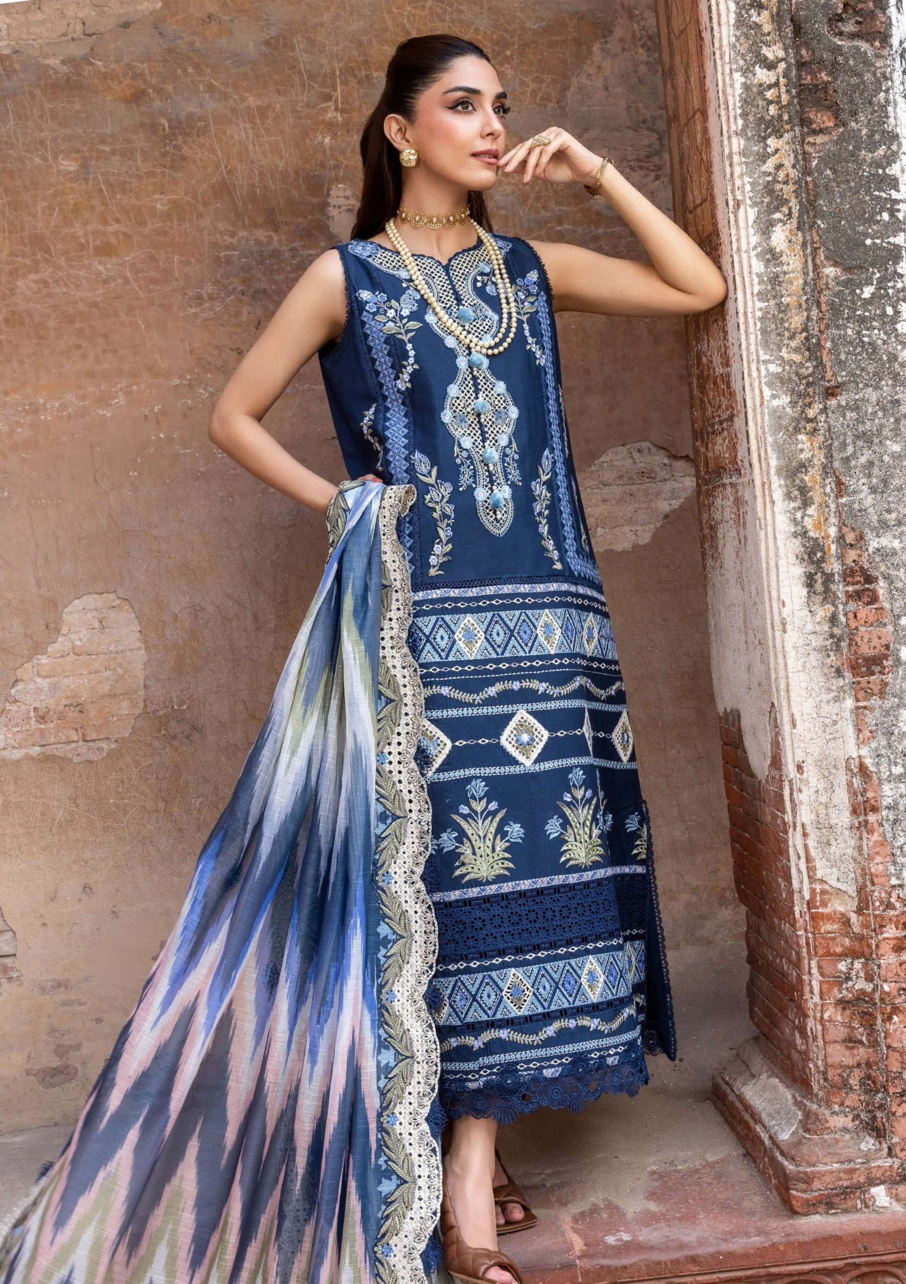 A vision of midnight elegance, this exquisite variant unfolds on a luxurious midnight-blue canvas, lavishly adorned with intricate Moroccan-inspired Schiffli embroidery in serene shades of azure, ivory, and sage. The interplay of these refined hues against the deep backdrop creates an aura of quiet mystery and timeless sophistication. Meticulously crafted embroidered borders, enriched with delicate cutwork insets, lend a regal opulence to the ensemble—each detail whispering stories of grace, charm, and masterful artistry. The craftsmanship elevates the silhouette, transforming it into a statement of understated luxury. Complementing the ensemble is a printed monar dupatta, rendered in a traditional Iznik pattern and framed with finely detailed jali embroidery along all four sides. Its fluid movement and intricate design introduce a sense of playful dynamism, beautifully balancing the richness of the base.