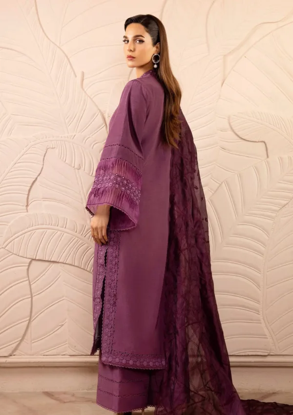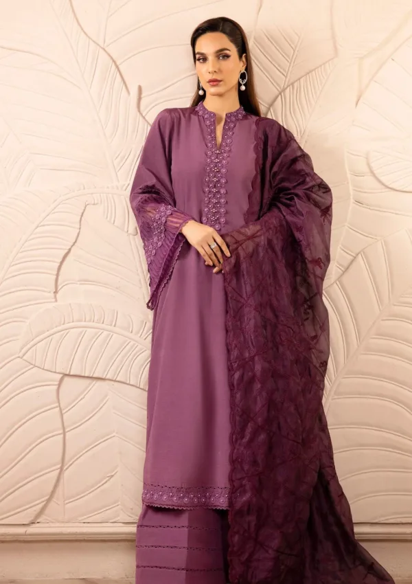 A stunning purple traditional outfit. The dress is designed with beautiful detailing on the sleeves and neckline, featuring delicate embroidery. The duppatta complements the dress with a soft, textured pattern, adding a touch of elegance. The overall look is graceful and stylish, ideal for formal events or special occasions.