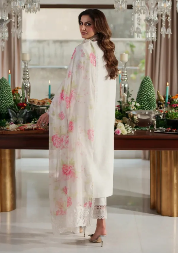 Add a touch of chic elegance to your wardrobe this season with this Clara eyelet cotton tunic. Rendered in a beautiful hue of dove white, this ensemble is the ultimate luxe evening wear. The neck line of the shirt is thoughtfully enhanced with cross-stitch embroidered rosette borders enhanced with laces and hand embellished motifs. The hemline and sleeves are further adorned with beautiful embroidered cross-stitch borders. Pair this stunner with our signature pants with lace and embroidery inserts. To complete the look style it with digital printed dupatta finished with embroidered pallu and lace detailing.